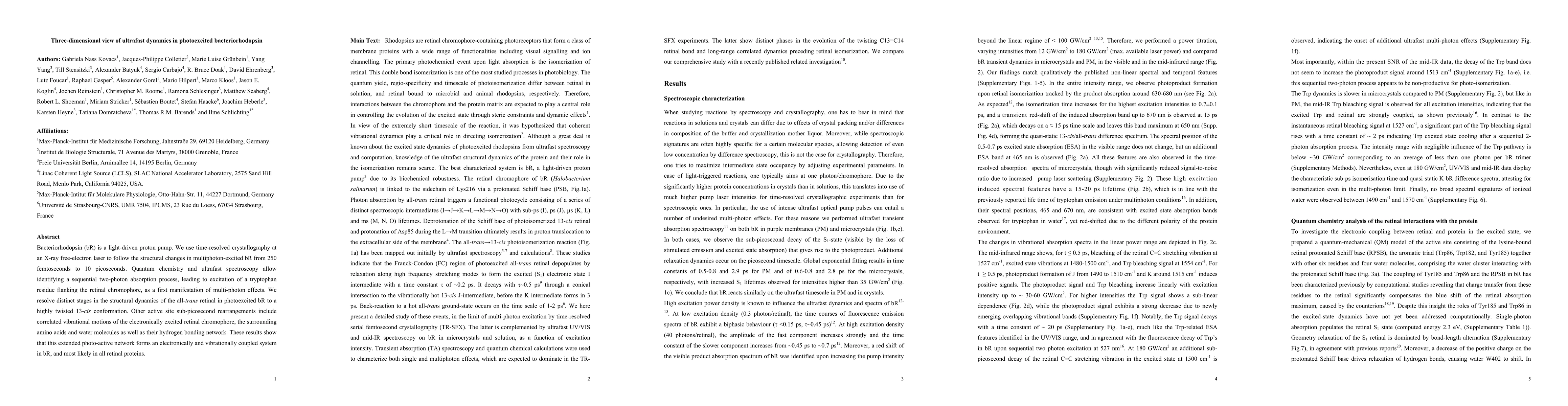 This paper employs time-resolved crystallography and ultrafast spectroscopy to track the structural dynamics of photoexcited bacteriorhodopsin, revealing a sequential two-photon absorption process leading to significant conformational changes in the retinal chromophore and correlated vibrational motions in the active site.