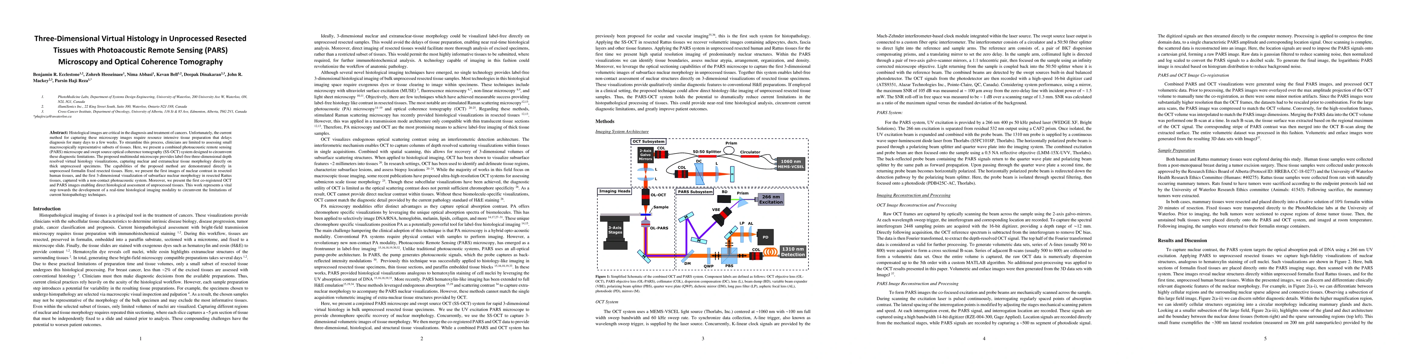 This paper introduces a novel combined photoacoustic remote sensing (PARS) microscope and optical coherence tomography (SS-OCT) system for real-time, label-free three-dimensional virtual histology in unprocessed resected tissues, significantly reducing the time and complexity of traditional tissue preparation methods. The system enables direct visualization of nuclear and extranuclear morphology in unprocessed formalin-fixed tissues, offering a potential breakthrough for rapid diagnostic imaging.