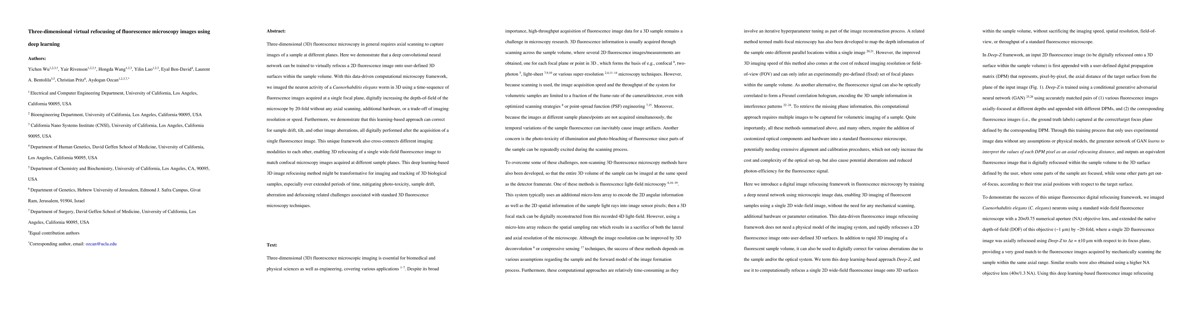 This paper presents a deep learning-based method for 3D refocusing of fluorescence microscopy images, enabling virtual refocusing of 2D images onto 3D surfaces within a sample without axial scanning. The approach significantly increases the depth-of-field and corrects for sample drift and aberrations digitally, offering transformative benefits for long-term 3D biological imaging.