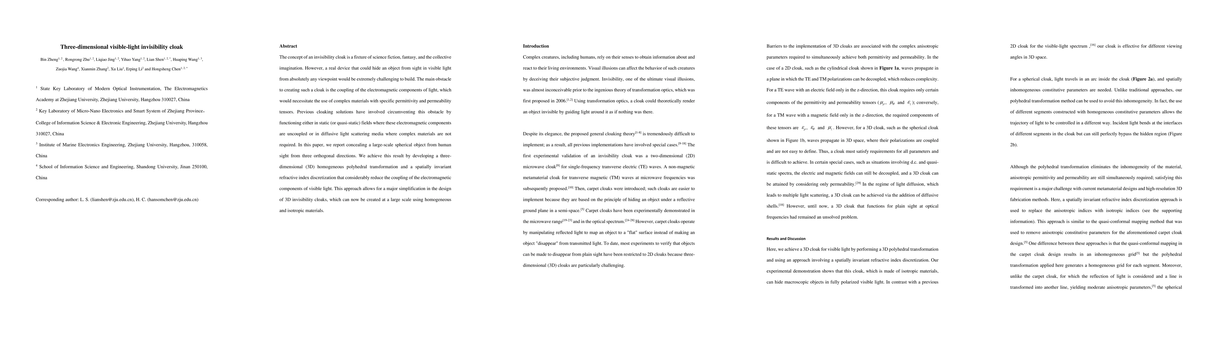 The research presents a 3D cloaking device using a homogeneous polyhedral transformation and spatially invariant refractive index discretization to conceal large-scale spherical objects from human sight in visible light from three orthogonal directions.