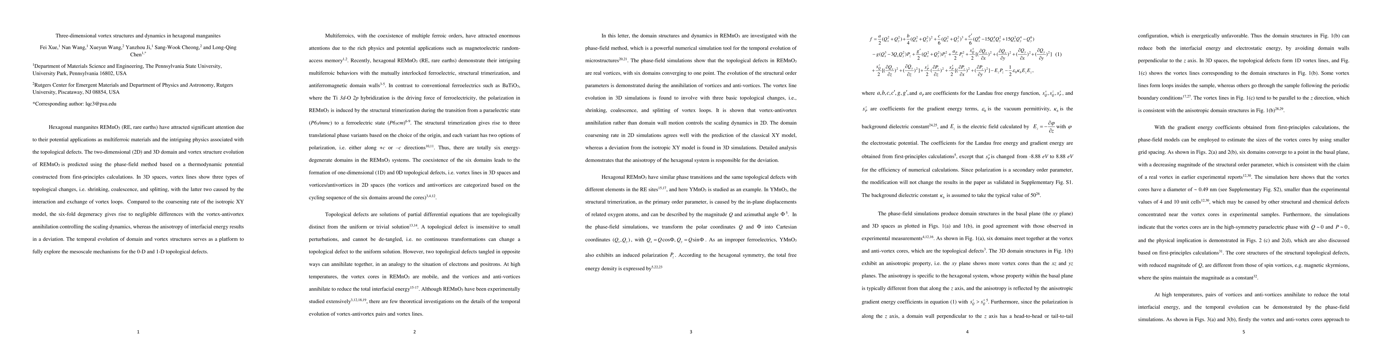 Hexagonal manganites REMnO3 (RE, rare earths) have attracted significant attention due to their potential applications as multiferroic materials and the intriguing physics associated with the topological defects. The two-dimensional (2D) and 3D domain and vortex structure evolution of REMnO3 is predicted using the phase-field method based on a thermodynamic potential constructed from first-principles calculations. In 3D spaces, vortex lines show three types of topological changes, i.e. shrinking, coalescence, and splitting, with the latter two caused by the interaction and exchange of vortex loops. Compared to the coarsening rate of the isotropic XY model, the six-fold degeneracy gives rise to negligible differences with the vortex-antivortex annihilation controlling the scaling dynamics, whereas the anisotropy of interfacial energy results in a deviation. The temporal evolution of domain and vortex structures serves as a platform to fully explore the mesoscale mechanisms for the 0-D and 1-D topological defects.