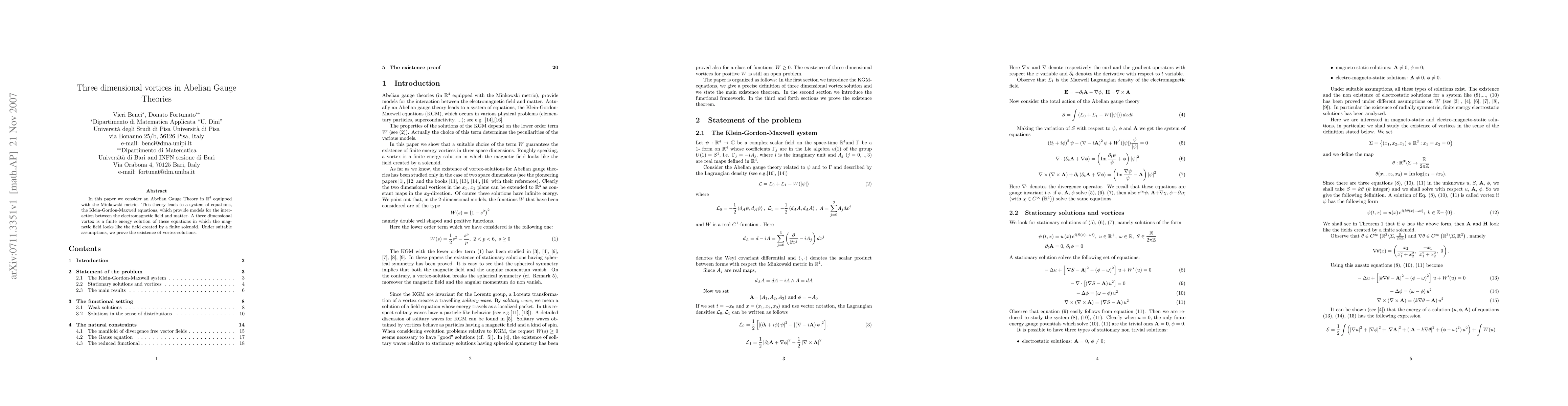 This paper proves the existence of three-dimensional vortices in Abelian Gauge Theories, which create a magnetic field similar to that of a finite solenoid, under suitable assumptions.