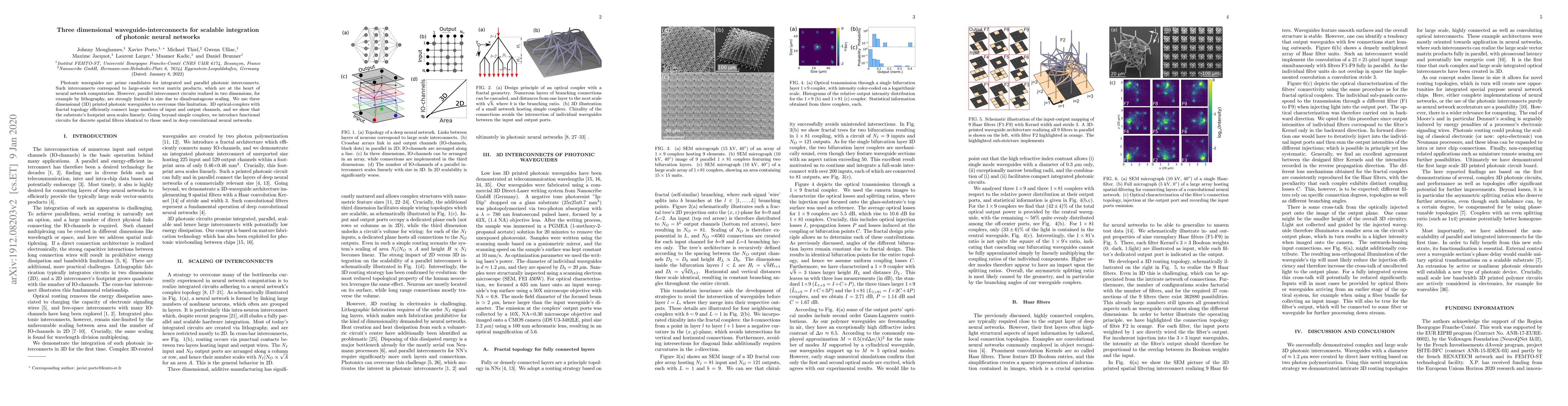 Photonic waveguides are prime candidates for integrated and parallel photonic interconnects. Such interconnects correspond to large-scale vector matrix products, which are at the heart of neural network computation. However, parallel interconnect circuits realized in two dimensions, for example by lithography, are strongly limited in size due to disadvantageous scaling. We use three dimensional (3D) printed photonic waveguides to overcome this limitation. 3D optical-couplers with fractal topology efficiently connect large numbers of input and output channels, and we show that the substrate's footprint area scales linearly. Going beyond simple couplers, we introduce functional circuits for discrete spatial filters identical to those used in deep convolutional neural networks.