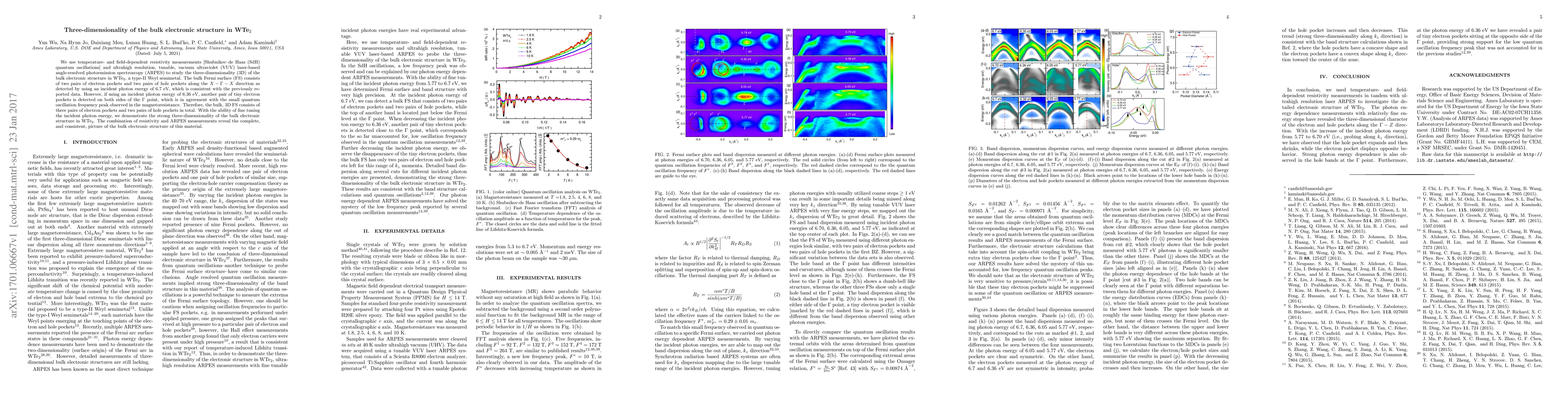 We use temperature- and field-dependent resistivity measurements [Shubnikov--de Haas (SdH) quantum oscillations] and ultrahigh resolution, tunable, vacuum ultraviolet (VUV) laser-based angle-resolved photoemission spectroscopy (ARPES) to study the three-dimensionality (3D) of the bulk electronic structure in WTe2, a type-II Weyl semimetal. The bulk Fermi surface (FS) consists of two pairs of electron pockets and two pairs of hole pockets along the X-Gamma-X direction as detected by using an incident photon energy of 6.7 eV, which is consistent with the previously reported data. However, if using an incident photon energy of 6.36 eV, another pair of tiny electron pockets is detected on both sides of the Gamma point, which is in agreement with the small quantum oscillation frequency peak observed in the magnetoresistance. Therefore, the bulk, 3D FS consists of three pairs of electron pockets and two pairs of hole pockets in total. With the ability of fine tuning the incident photon energy, we demonstrate the strong three-dimensionality of the bulk electronic structure in WTe2. The combination of resistivity and ARPES measurements reveal the complete, and consistent, picture of the bulk electronic structure of this material.