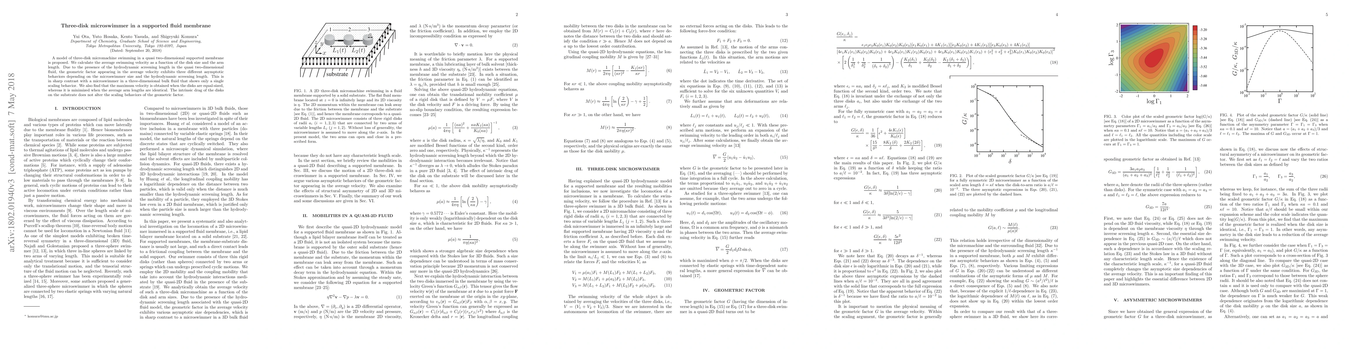 This paper proposes a model for a three-disk microswimmer in a quasi two-dimensional supported fluid membrane, finding distinct scaling behaviors for average swimming velocity based on disk size and arm length. The maximum velocity occurs with equal-sized disks, contrasting with the single scaling behavior in three-dimensional bulk fluids.