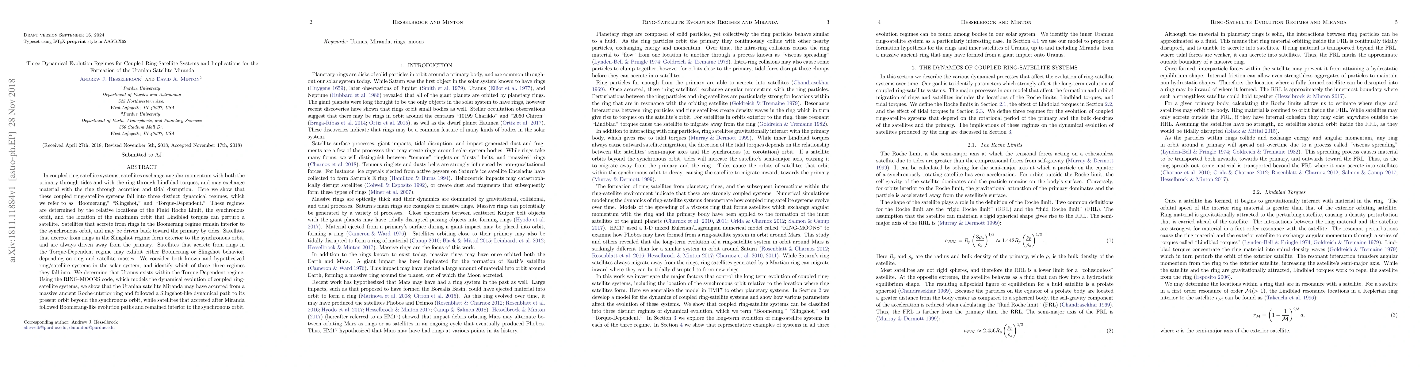In coupled ring-satellite systems, satellites exchange angular momentum with both the primary through tides and with the ring through Lindblad torques, and may exchange material with the ring through accretion and tidal disruption. Here we show that these coupled ring-satellite systems fall into three distinct dynamical regimes, which we refer to as `Boomerang,' `Slingshot,' and `Torque-Dependent.' These regimes are determined by the relative locations of the Fluid Roche Limit, the synchronous orbit, and the location of the maximum orbit that Lindblad torques can perturb a satellite. Satellites that accrete from rings in the Boomerang regime remain interior to the synchronous orbit, and may be driven back toward the primary by tides. Satellites that accrete from rings in the Slingshot regime form exterior to the synchronous orbit, and are always driven away from the primary. Satellites that accrete from rings in the Torque-Dependent regime may exhibit either Boomerang or Slingshot behavior, depending on ring and satellite masses. We consider both known and hypothesized ring/satellite systems in the solar system, and identify which of these three regimes they fall into. We determine that Uranus exists within the Torque-Dependent regime. Using the RING-MOONS code, which models the dynamical evolution of coupled ring-satellite systems, we show that the Uranian satellite Miranda may have accreted from a massive ancient Roche-interior ring and followed a Slingshot-like dynamical path to its present orbit beyond the synchronous orbit, while satellites that accreted after Miranda followed Boomerang-like evolution paths and remained interior to the synchronous orbit.