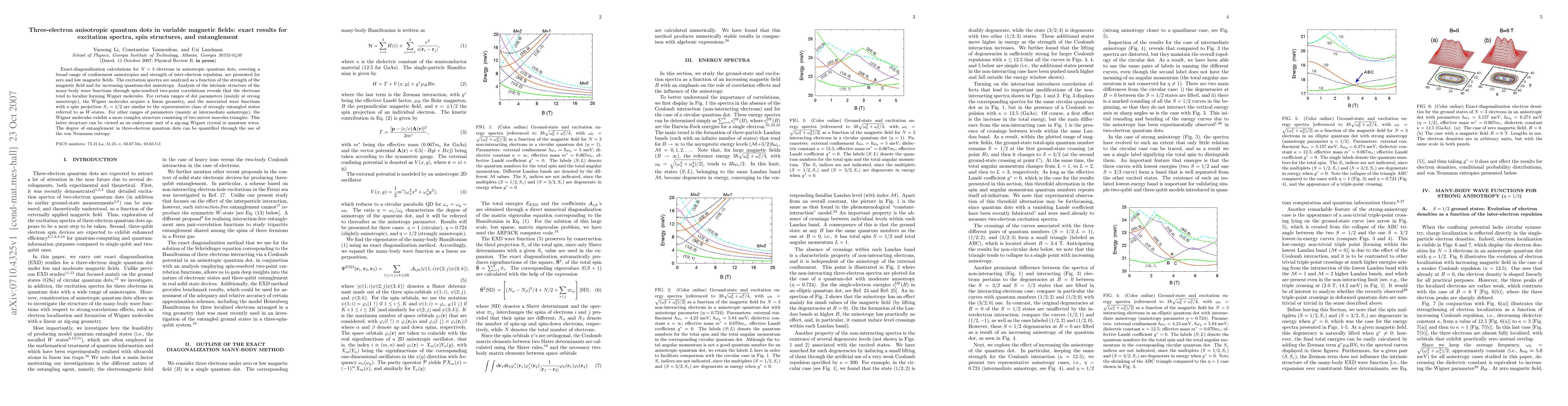 This paper presents exact-diagonalization calculations for three electrons in anisotropic quantum dots, revealing excitation spectra and spin structures. It finds that electrons localize into Wigner molecules, which can form linear or triangular configurations, with the latter hinting at potential zig-zag crystal structures.
