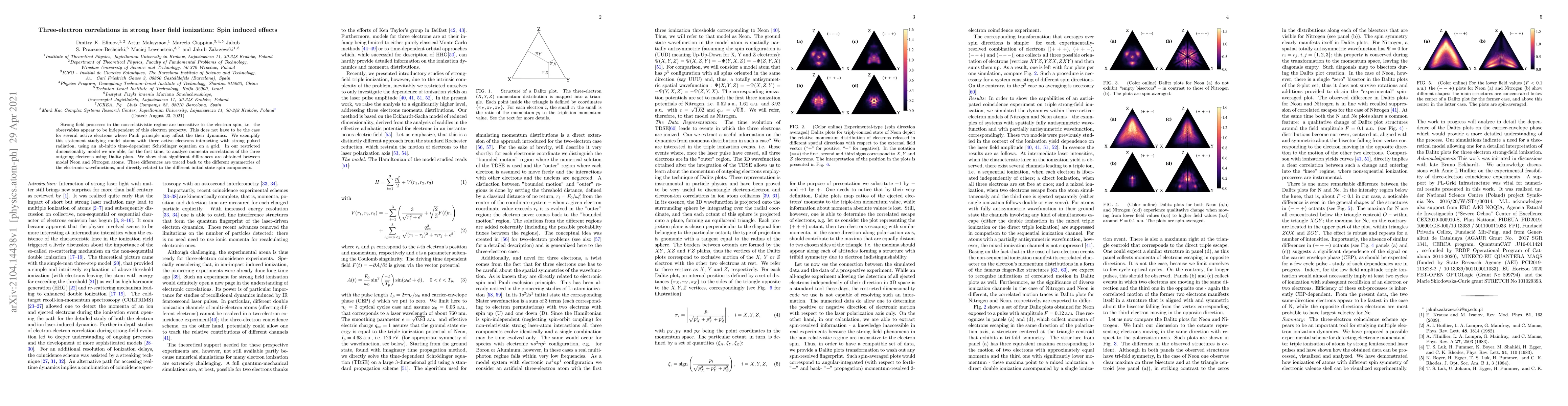 Strong field processes in the non-relativistic regime are insensitive to the electron spin, i.e. the observables appear to be independent of this electron property. This does not have to be the case for several active electrons where Pauli principle may affect the their dynamics. We exemplify this statement studying model atoms with three active electrons interacting with strong pulsed radiation, using an ab-initio time-dependent Schr\"odinger equation on a grid. In our restricted dimensionality model we are able, for the first time, to analyse momenta correlations of the three outgoing electrons using Dalitz plots. We show that significant differences are obtained between model Neon and Nitrogen atoms. These differences are traced back to the different symmetries of the electronic wavefunctions, and directly related to the different initial state spin components.
