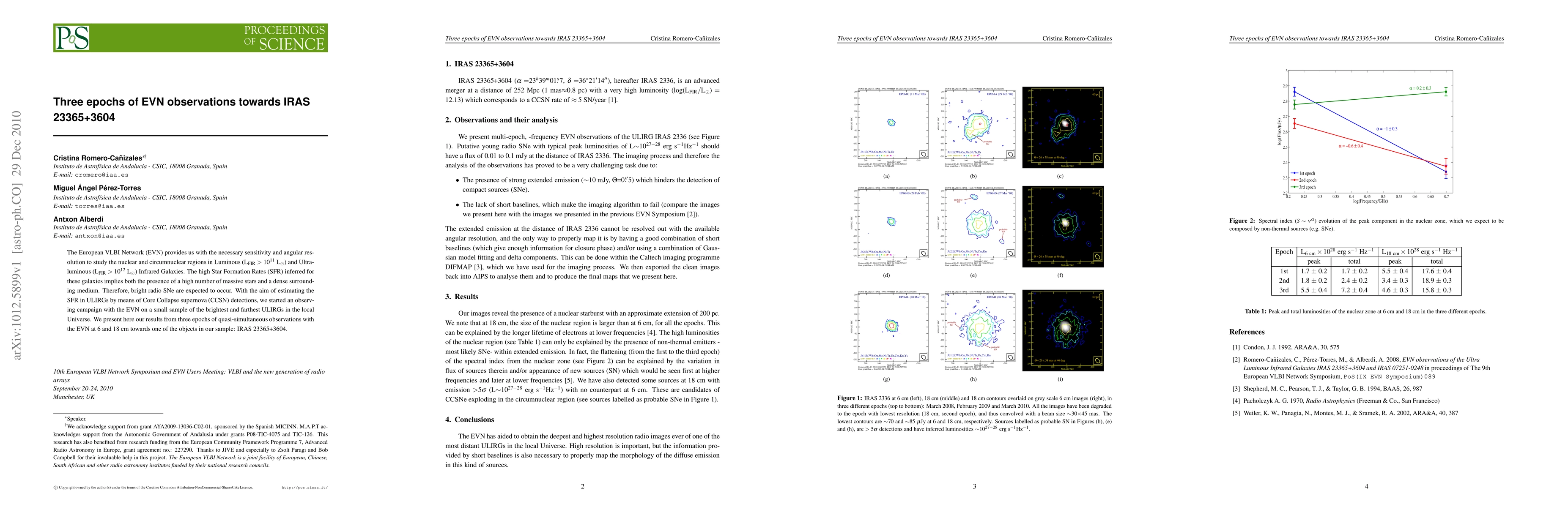 The European VLBI Network (EVN) provides us with the necessary sensitivity and angular resolution to study the nuclear and circumnuclear regions in Luminous and Ultraluminous Infrared Galaxies. The high Star Formation Rates (SFR) inferred for these galaxies implies both the presence of a high number of massive stars and a dense surrounding medium. Therefore, bright radio SNe are expected to occur. With the aim of estimating the SFR in ULIRGs by means of Core Collapse supernova (CCSN) detections, we started an observing campaign with the EVN on a small sample of the brightest and farthest ULIRGs in the local Universe. We present here our results from three epochs of quasi-simultaneous observations with the EVN at 6 and 18 cm towards one of the objects in our sample: IRAS 23365+3604.