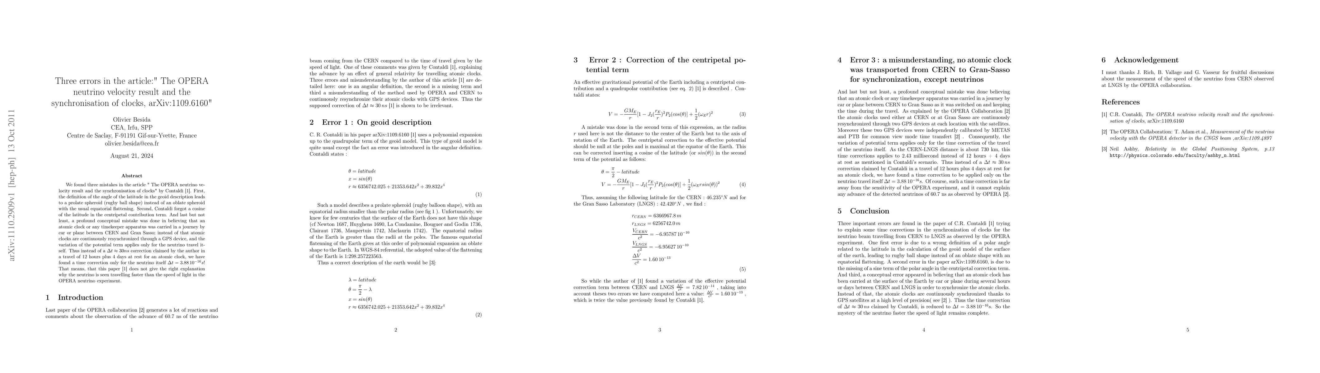 This paper identifies three errors in Contaldi's article on the OPERA neutrino velocity result, including incorrect geoid shape definition, missing cosine term, and a misunderstanding of clock synchronization methods, ultimately concluding that the original paper fails to correctly explain the faster-than-light neutrino observation.