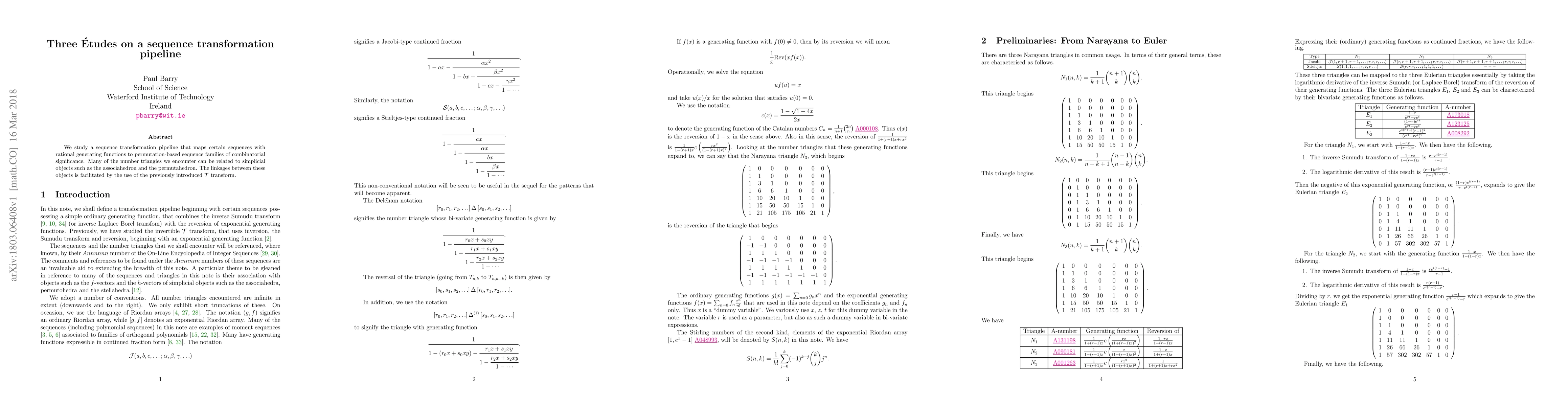 We study a sequence transformation pipeline that maps certain sequences with rational generating functions to permutation-based sequence families of combinatorial significance. Many of the number triangles we encounter can be related to simplicial objects such as the associahedron and the permutahedron. The linkages between these objects is facilitated by the use of the previously introduced $\mathcal{T}$ transform.