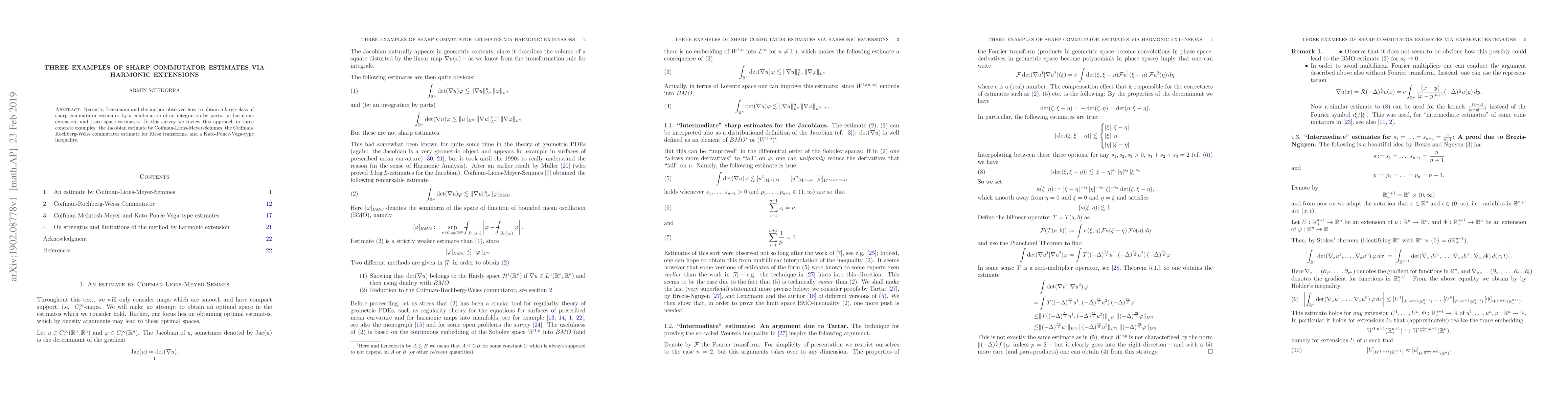 Recently, Lenzmann and the author observed how to obtain a large class of sharp commutator estimates by a combination of an integration by parts, an harmonic extension, and trace space estimates. In this survey we review this approach in three concrete examples: the Jacobian estimate by Coifman-Lions-Meyer-Semmes, the Coifman-Rochberg-Weiss commutator estimate for Riesz transforms, and a Kato-Ponce-Vega-type inequality.