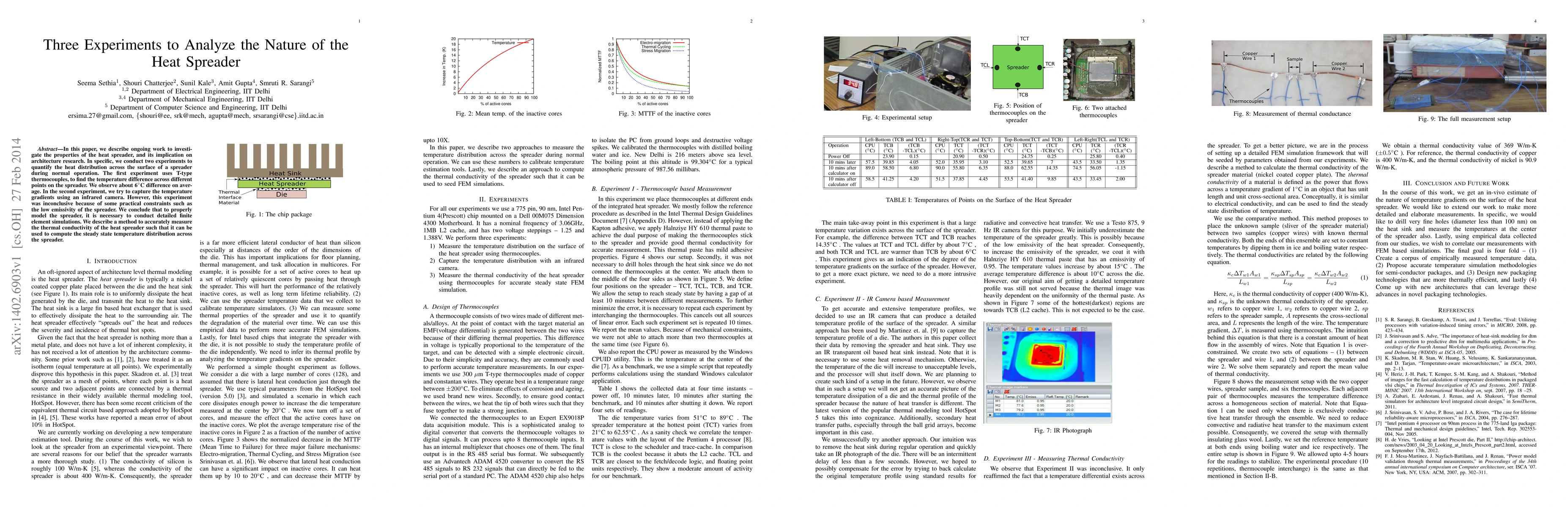 In this paper, we describe ongoing work to investigate the properties of the heat spreader, and its implication on architecture research. In specific, we conduct two experiments to quantify the heat distribution across the surface of a spreader during normal operation. The first experiment uses T-type thermocouples, to find the temperature difference across different points on the spreader. We observe about a 6 degree celsius temperature difference on average. In the second experiment, we try to capture the temperature gradients using an infrared camera. However, this experiment was inconclusive because of some practical constraints such as the low emissivity of the spreader. We conclude that to properly model the spreader, it is necessary to conduct detailed finite element simulations. We describe a method to accurately measure the thermal conductivity of the heat spreader such that it can be used to compute the steady state temperature distribution across the spreader.