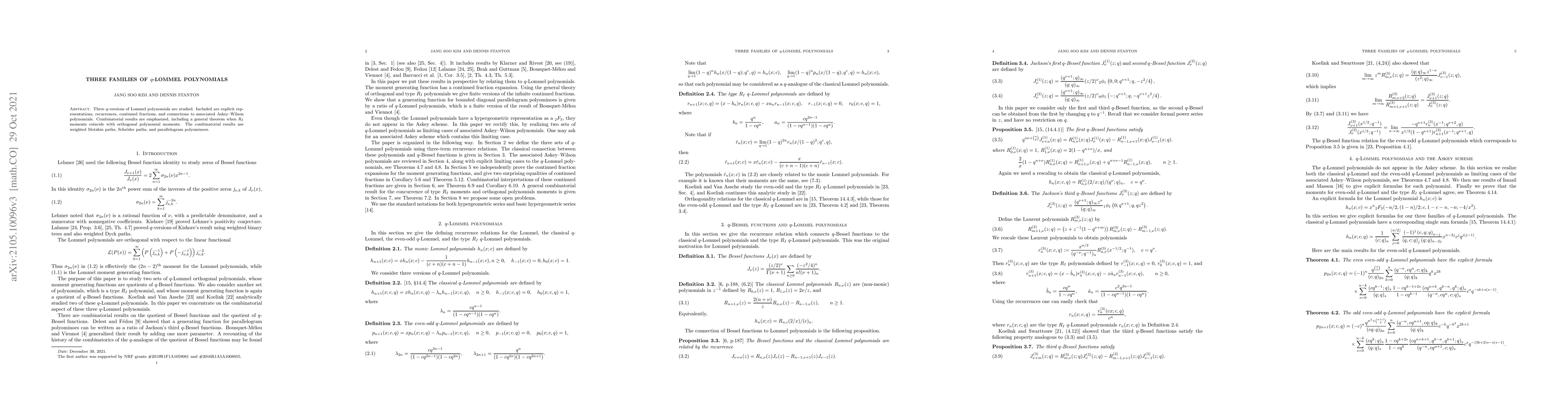 This paper explores three $q$-versions of Lommel polynomials, focusing on their explicit representations, recurrences, and connections to Askey--Wilson polynomials. It highlights combinatorial results, particularly the coincidence of $R_I$ moments with orthogonal polynomial moments, using weighted Motzkin paths, Schröder paths, and parallelogram polyominoes.