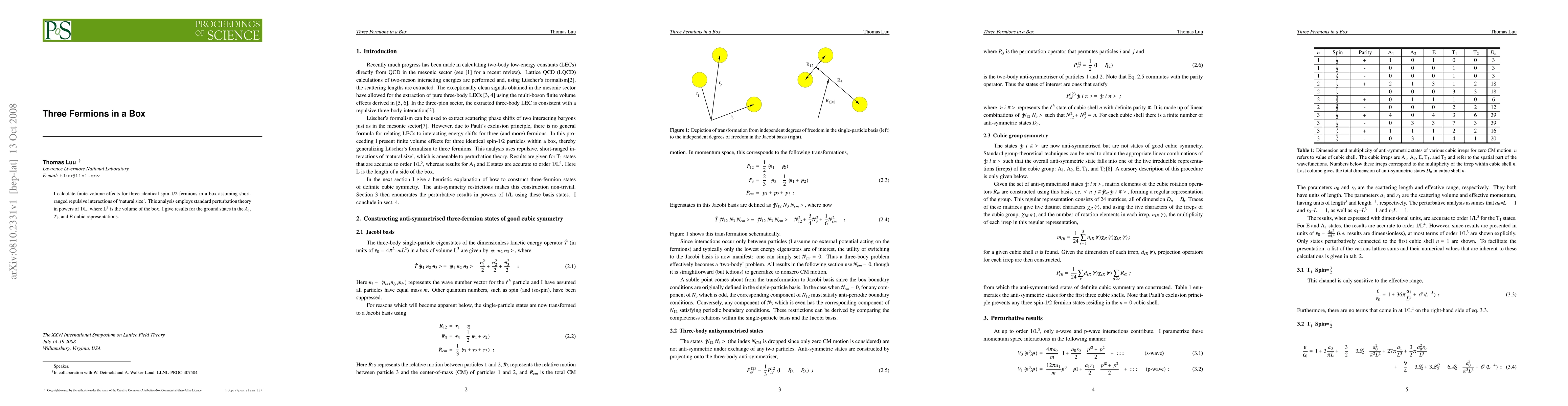 I calculate finite-volume effects for three identical spin-1/2 fermions in a box assuming short-ranged repulsive interactions of `natural size'. This analysis employs standard perturbation theory in powers of 1/L, where L^3 is the volume of the box. I give results for the ground states in the A_1, T_1, and E cubic representations.