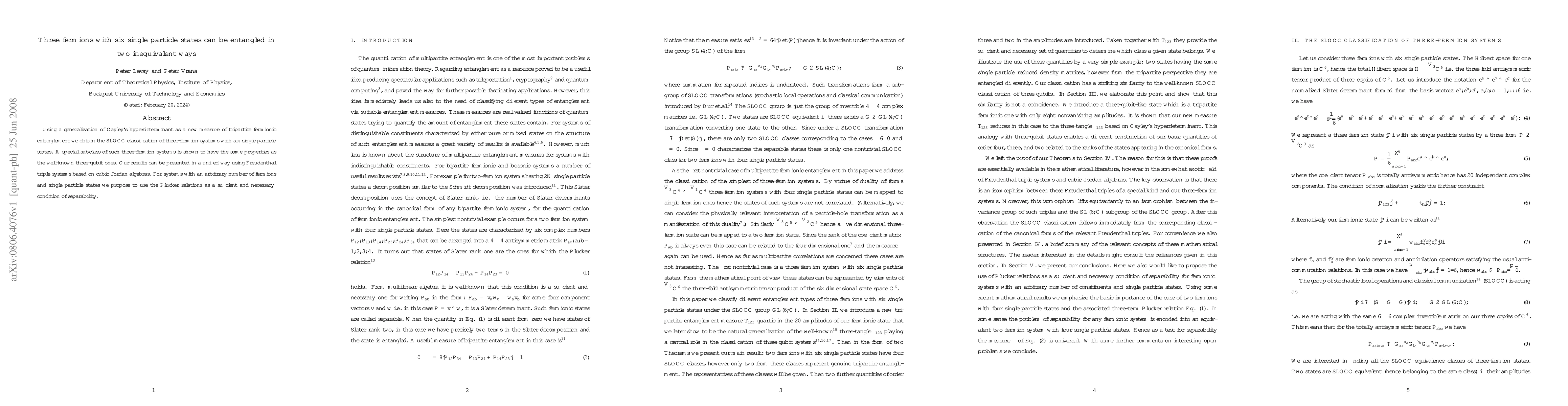 Using a generalization of Cayley's hyperdeterminant as a new measure of tripartite fermionic entanglement we obtain the SLOCC classification of three-fermion systems with six single particle states. A special subclass of such three-fermion systems is shown to have the same properties as the well-known three-qubit ones. Our results can be presented in a unified way using Freudenthal triple systems based on cubic Jordan algebras. For systems with an arbitrary number of fermions and single particle states we propose the Pl\"ucker relations as a sufficient and necessary condition of separability.