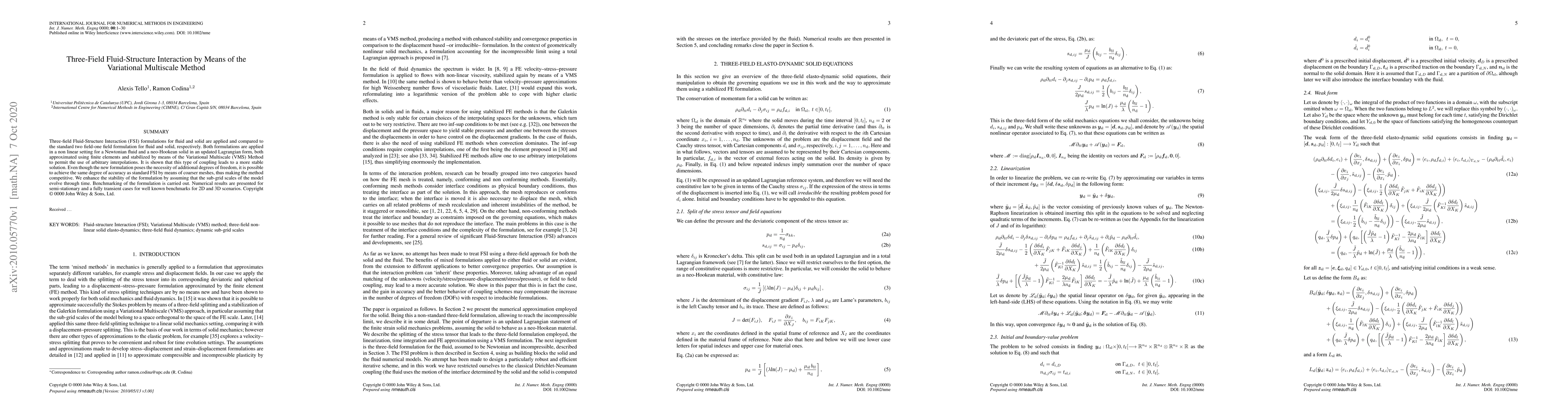 Three-field Fluid-Structure Interaction (FSI) formulations for fluid and solid are applied and compared to the standard two field-one field formulation for fluid and solid, respectively. Both formulations are applied in a non linear setting for a Newtonian fluid and a neo-Hookean solid in an updated Lagrangian form, both approximated using finite elements and stabilized by means of the Variational Multiscale (VMS) Method to permit the use of arbitrary interpolations. It is shown that this type of coupling leads to a more stable solution. Even though the new formulation poses the necessity of additional degrees of freedom, it is possible to achieve the same degree of accuracy as standard FSI by means of coarser meshes, thus making the method competitive. We enhance the stability of the formulation by assuming that the sub-grid scales of the model evolve through time. Benchmarking of the formulation is carried out. Numerical results are presented for semi-stationary and a fully transient cases for well known benchmarks for 2D and 3D scenarios.