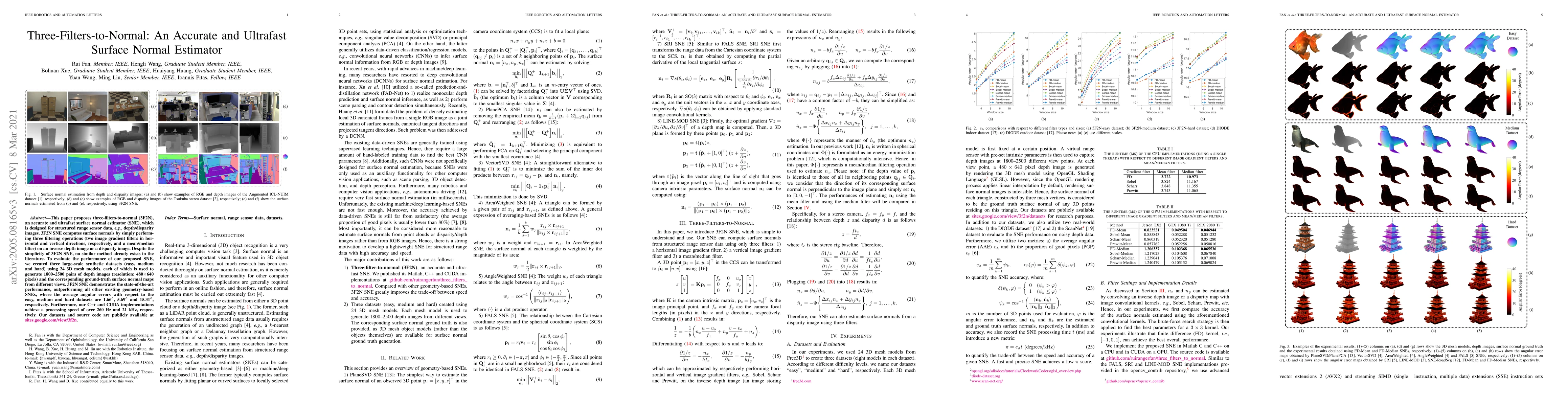 The paper introduces "Three-Filters-to-Normal" (3F2N), an efficient and accurate surface normal estimator for structured range sensor data, achieving state-of-the-art performance with minimal computational complexity. The method outperforms existing geometry-based estimators and processes at speeds exceeding 260 Hz using C++ and 21 kHz with CUDA.