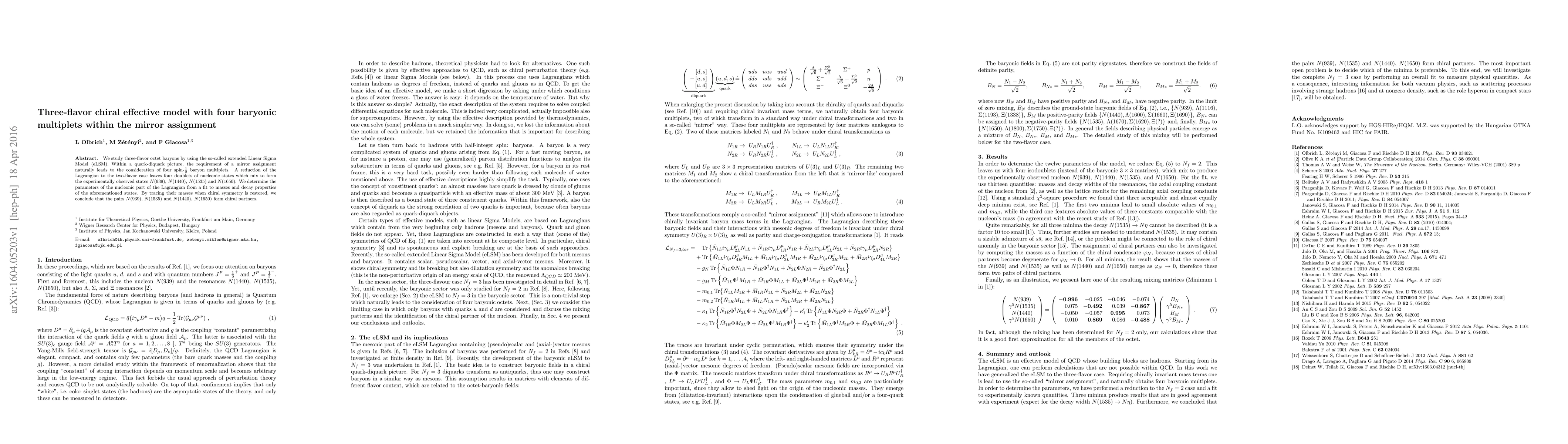 We study three-flavor octet baryons by using the so-called extended Linear Sigma Model (eLSM). Within a quark-diquark picture, the requirement of a mirror assignment naturally leads to the consideration of four spin-$\frac{1}{2}$ baryon multiplets. A reduction of the Lagrangian to the two-flavor case leaves four doublets of nucleonic states which mix to form the experimentally observed states $N(939)$, $N(1440)$, $N(1535)$ and $N(1650)$. We determine the parameters of the nucleonic part of the Lagrangian from a fit to masses and decay properties of the aforementioned states. By tracing their masses when chiral symmetry is restored, we conclude that the pairs $N(939)$, $N(1535)$ and $N(1440)$, $N(1650)$ form chiral partners.