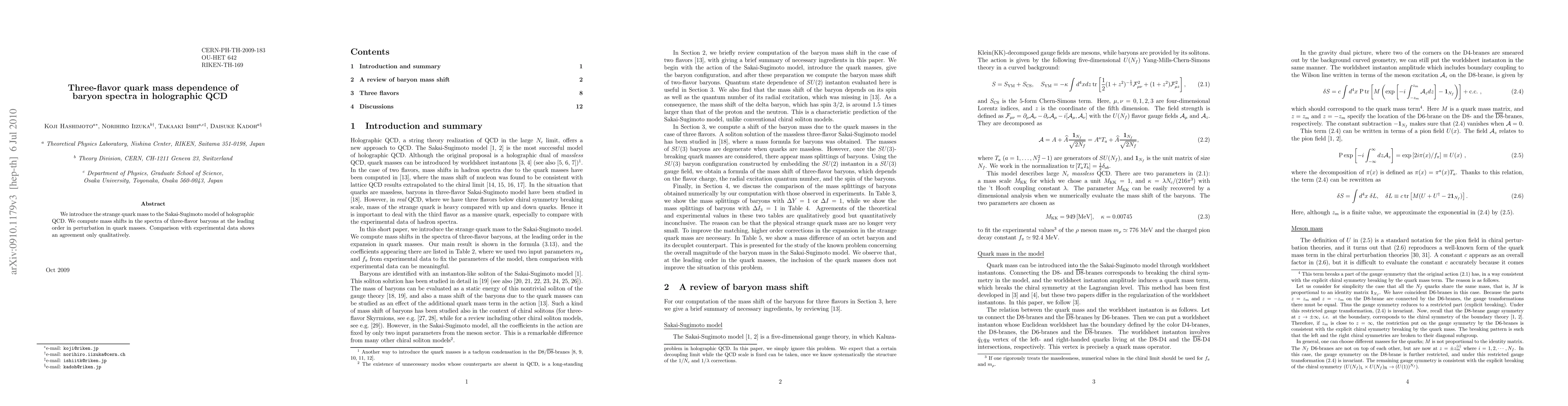 This paper extends the Sakai-Sugimoto model to include strange quark mass, calculating leading-order mass shifts in three-flavor baryon spectra. While the theoretical predictions show qualitative agreement with experimental data, discrepancies remain.