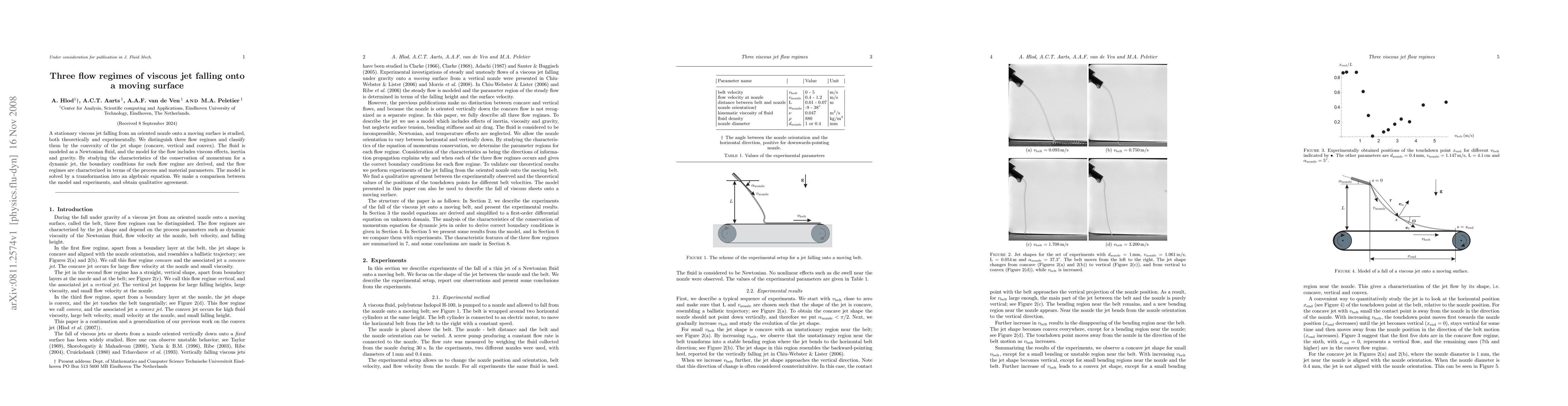 A stationary viscous jet falling from an oriented nozzle onto a moving surface is studied, both theoretically and experimentally. We distinguish three flow regimes and classify them by the convexity of the jet shape (concave, vertical and convex). The fluid is modeled as a Newtonian fluid, and the model for the flow includes viscous effects, inertia and gravity. By studying the characteristics of the conservation of momentum for a dynamic jet, the boundary conditions for each flow regime are derived, and the flow regimes are characterized in terms of the process and material parameters. The model is solved by a transformation into an algebraic equation. We make a comparison between the model and experiments, and obtain qualitative agreement.