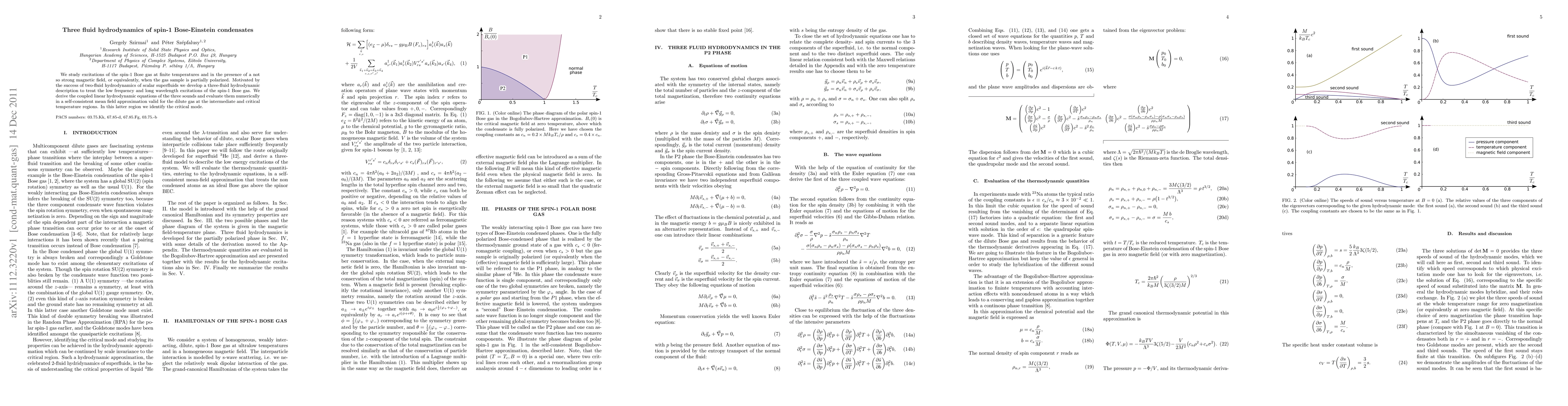 We study excitations of the spin-1 Bose gas at finite temperatures and in the presence of a not so strong magnetic field, or equivalently, when the gas sample is partially polarized. Motivated by the success of two-fluid hydrodynamics of scalar superfluids we develop a three-fluid hydrodynamic description to treat the low frequency and long wavelength excitations of the spin-1 Bose gas. We derive the coupled linear hydrodynamic equations of the three sounds and evaluate them numerically in a self-consistent mean field approximation valid for the dilute gas at the intermediate and critical temperature regions. In this latter region we identify the critical mode.