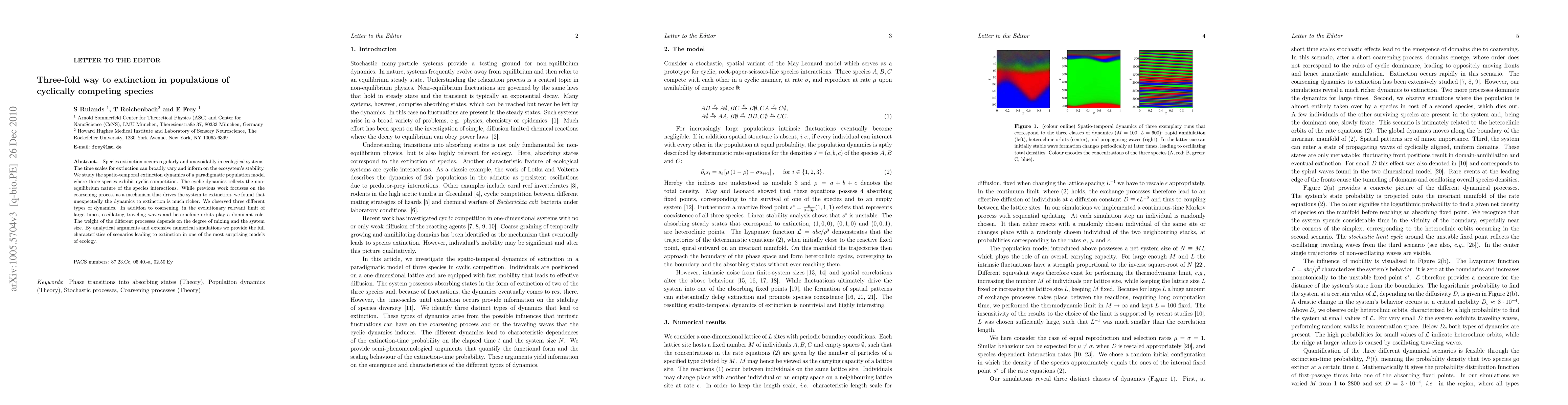 This paper investigates the extinction dynamics in a three-species cyclic competition model, revealing three distinct extinction pathways: coarsening, oscillating traveling waves, and heteroclinic orbits. The study highlights how the degree of mixing and system size influence these extinction processes, offering a comprehensive analysis of ecological extinction mechanisms.