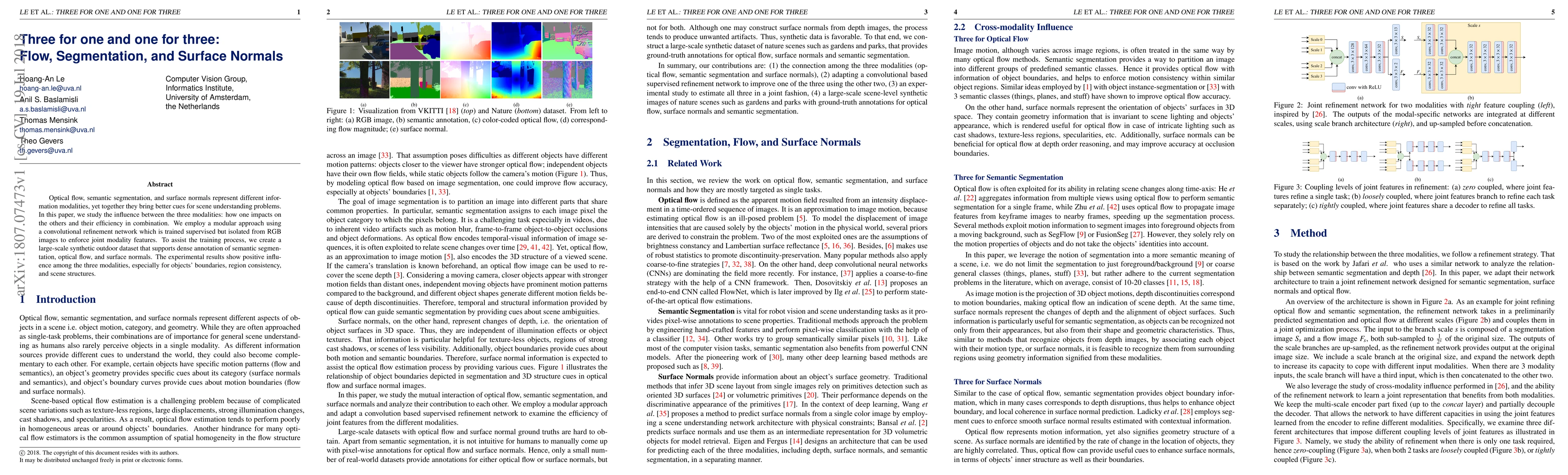 Optical flow, semantic segmentation, and surface normals represent different information modalities, yet together they bring better cues for scene understanding problems. In this paper, we study the influence between the three modalities: how one impacts on the others and their efficiency in combination. We employ a modular approach using a convolutional refinement network which is trained supervised but isolated from RGB images to enforce joint modality features. To assist the training process, we create a large-scale synthetic outdoor dataset that supports dense annotation of semantic segmentation, optical flow, and surface normals. The experimental results show positive influence among the three modalities, especially for objects' boundaries, region consistency, and scene structures.