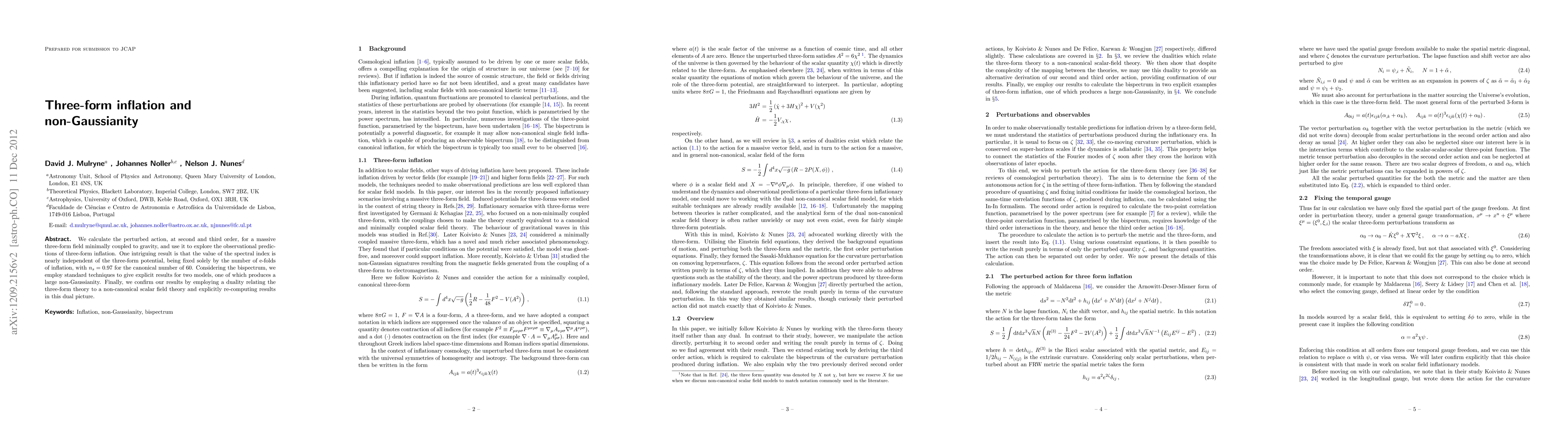 We calculate the perturbed action, at second and third order, for a massive three-form field minimally coupled to gravity, and use it to explore the observational predictions of three-form inflation. One intriguing result is that the value of the spectral index is nearly independent of the three-form potential, being fixed solely by the number of e-folds of inflation, with n_s=0.97 for the canonical number of 60. Considering the bispectrum, we employ standard techniques to give explicit results for two models, one of which produces a large non-Gaussianity. Finally, we confirm our results by employing a duality relating the three-form theory to a non-canonical scalar field theory and explicitly re-computing results in this dual picture.