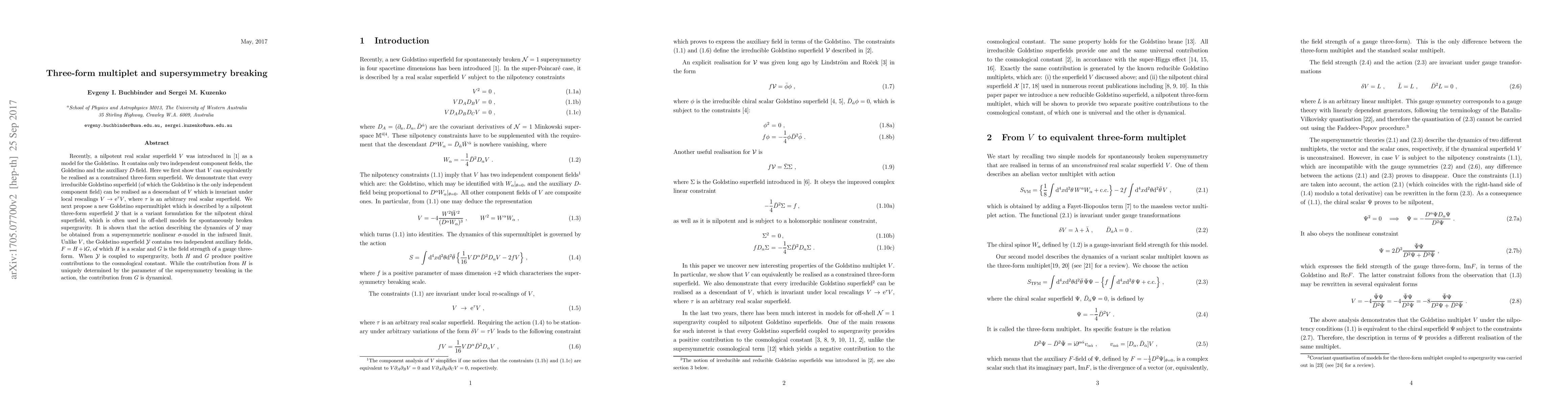 Recently, a nilpotent real scalar superfield $V$ was introduced in arXiv:1702.02423 as a model for the Goldstino. It contains only two independent component fields, the Goldstino and the auxiliary $D$-field. Here we first show that $V$ can equivalently be realised as a constrained three-form superfield. We demonstrate that every irreducible Goldstino superfield (of which the Goldstino is the only independent component field) can be realised as a descendant of $V$ which is invariant under local rescalings $V \to {\rm e}^\tau V$, where $\tau$ is an arbitrary real scalar superfield. We next propose a new Goldstino supermultiplet which is described by a nilpotent three-form superfield $\cal Y$ that is a variant formulation for the nilpotent chiral superfield, which is often used in off-shell models for spontaneously broken supergravity. It is shown that the action describing the dynamics of $\cal Y$ may be obtained from a supersymmetric nonlinear $\sigma$-model in the infrared limit. Unlike $V$, the Goldstino superfield $\cal Y$ contains two independent auxiliary fields, $F= H+{\rm i} G$, of which $H$ is a scalar and $G$ is the field strength of a gauge three-form. When $\cal Y$ is coupled to supergravity, both $H$ and $G$ produce positive contributions to the cosmological constant. While the contribution from $H$ is uniquely determined by the parameter of the supersymmetry breaking in the action, the contribution from $G$ is dynamical.
