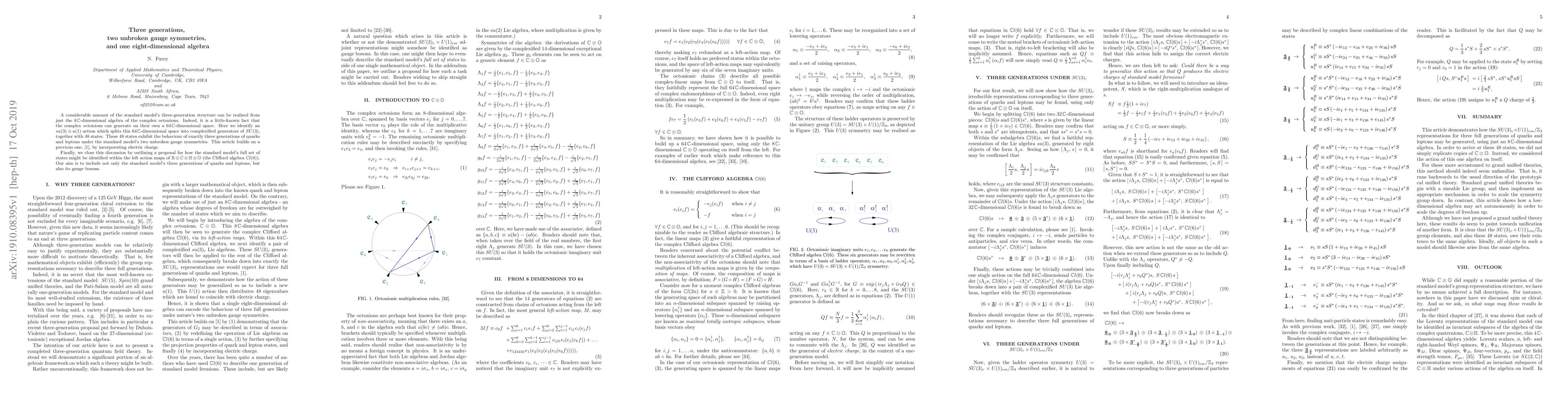 A considerable amount of the standard model's three-generation structure can be realised from just the $8\hspace{.3mm}\mathbb{C}$-dimensional algebra of the complex octonions. Indeed, it is a little-known fact that the complex octonions can generate on their own a $64\hspace{.3mm}\mathbb{C}$-dimensional space. Here we identify an $su(3)\oplus u(1)$ action which splits this $64\hspace{.3mm}\mathbb{C}$-dimensional space into complexified generators of $SU(3)$, together with 48 states. These 48 states exhibit the behaviour of exactly three generations of quarks and leptons under the standard model's two unbroken gauge symmetries. This article builds on a previous one, [1], by incorporating electric charge. Finally, we close this discussion by outlining a proposal for how the standard model's full set of states might be identified within the left action maps of $\mathbb{R}\otimes\mathbb{C}\otimes\mathbb{H}\otimes\mathbb{O}$ (the Clifford algebra $\mathbb{C} l(8)$). Our aim is to include not only the standard model's three generations of quarks and leptons, but also its gauge bosons.