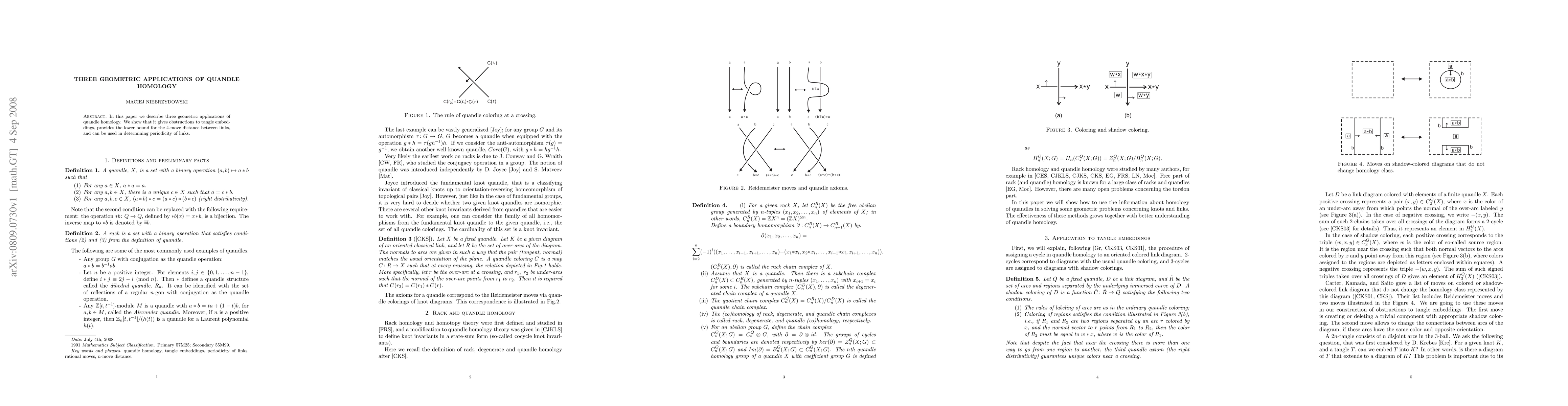 Summary: This paper explores quandle homology's geometric applications, revealing its role in obstructing tangle embeddings, establishing a lower bound for the 4-move distance between links, and aiding in the determination of link periodicity.