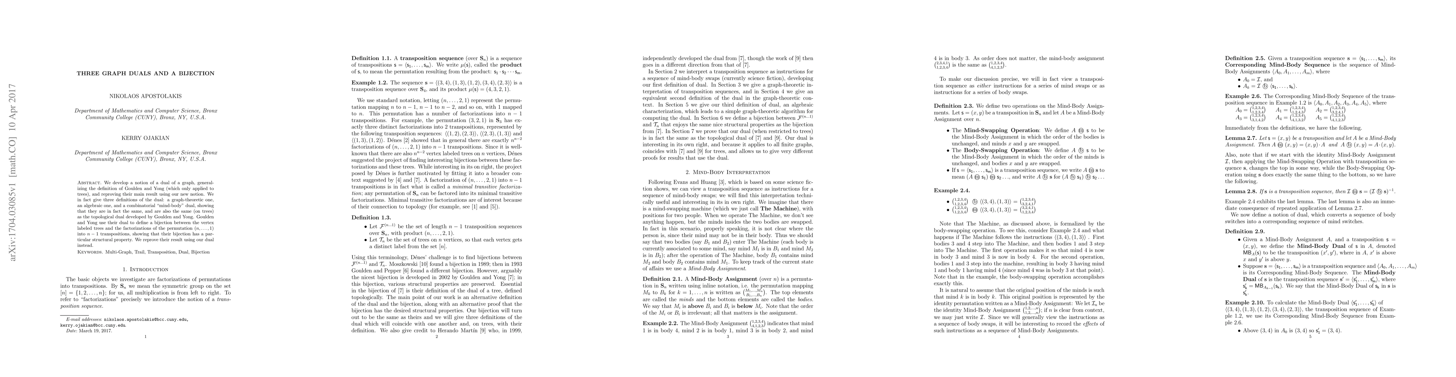 We develop a notion of a dual of a graph, generalizing the definition of Goulden and Yong (which only applied to trees), and reproving their main result using our new notion. We in fact give three definitions of the dual: a graph-theoretic one, an algebraic one, and a combinatorial "mind-body" dual, showing that they are in fact the same, and are also the same (on trees) as the topological dual developed by Goulden and Yong. Goulden and Yong use their dual to define a bijection between the vertex labeled trees and the factorizations of the permutation $(n, \ldots, 1)$ into $n-1$ transpositions, showing that their bijection has a particular structural property. We reprove their result using our dual instead.