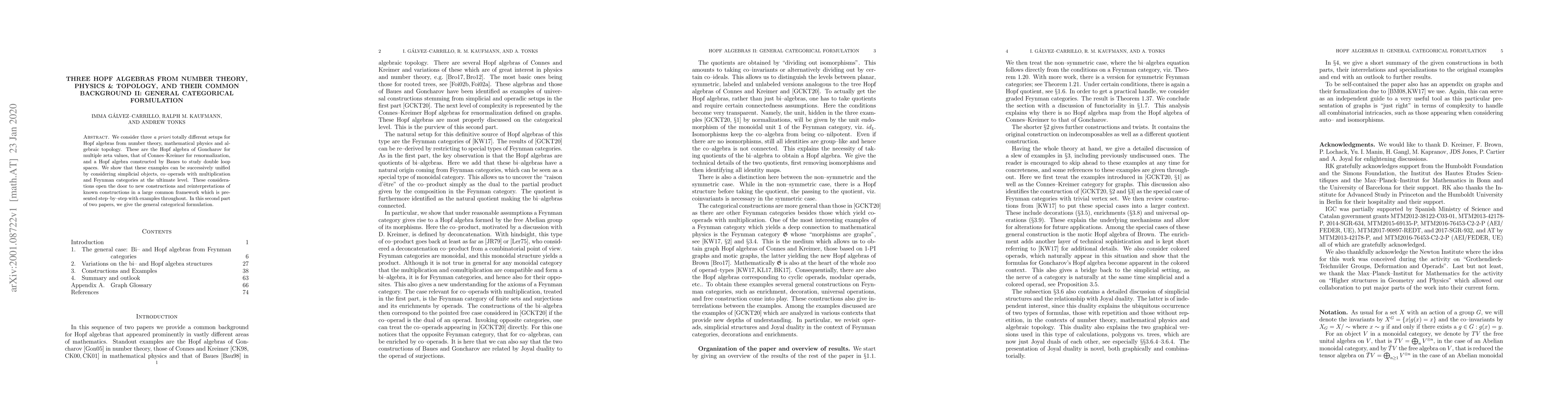 We consider three a priori totally different setups for Hopf algebras from number theory, mathematical physics and algebraic topology. These are the Hopf algebra of Goncharov for multiple zeta values, that of Connes-Kreimer for renormalization, and a Hopf algebra constructed by Baues to study double loop spaces. We show that these examples can be successively unified by considering simplicial objects, co-operads with multiplication and Feynman categories at the ultimate level. These considerations open the door to new constructions and reinterpretations of known constructions in a large common framework which is presented step-by-step with examples throughout. In this second part of two papers, we give the general categorical formulation.