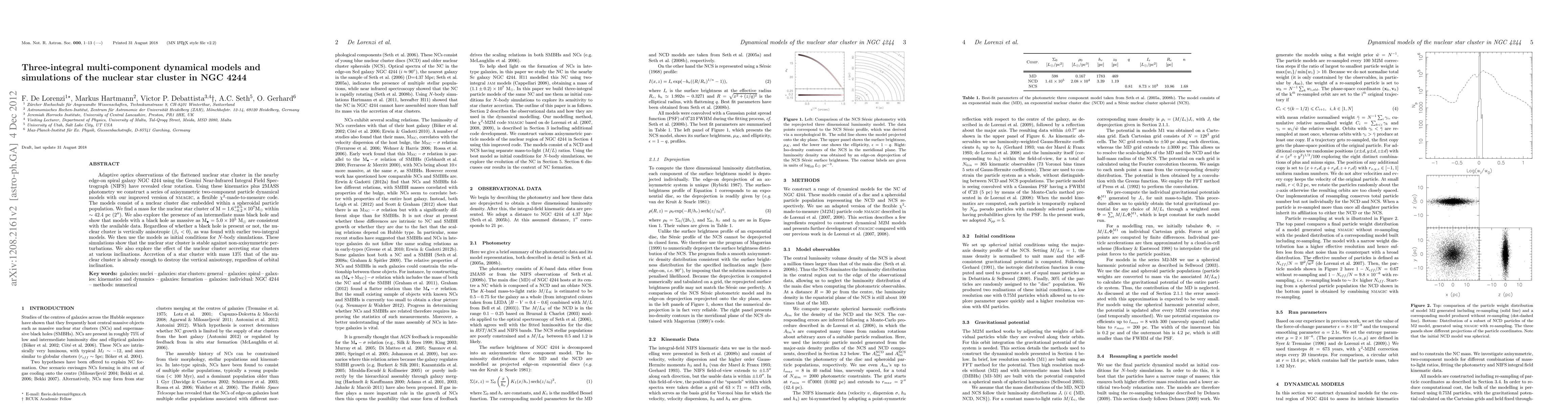 Adaptive optics observations of the flattened nuclear star cluster in the nearby edge-on spiral galaxy NGC 4244 using the Gemini Near-Infrared Integral Field Spectrograph (NIFS) have revealed clear rotation. Using these kinematics plus 2MASS photometry we construct a series of axisymmetric two-component particle dynamical models with our improved version of NMAGIC, a flexible Chi^2-made-to-measure code. The models consist of a nuclear cluster disc embedded within a spheroidal particle population. We find a mass for the nuclear star cluster of M=1.6^+0.5_-0.2 x 10^7 M_sun within ~42.4 pc (2"). We also explore the presence of an intermediate mass black hole and show that models with a black hole as massive as M_bh = 5.0 x 10^5 M_sun are consistent with the available data. Regardless of whether a black hole is present or not, the nuclear cluster is vertically anisotropic (beta_z < 0), as was found with earlier two-integral models. We then use the models as initial conditions for N-body simulations. These simulations show that the nuclear star cluster is stable against non-axisymmetric perturbations. We also explore the effect of the nuclear cluster accreting star clusters at various inclinations. Accretion of a star cluster with mass 13% that of the nuclear cluster is already enough to destroy the vertical anisotropy, regardless of orbital inclination.