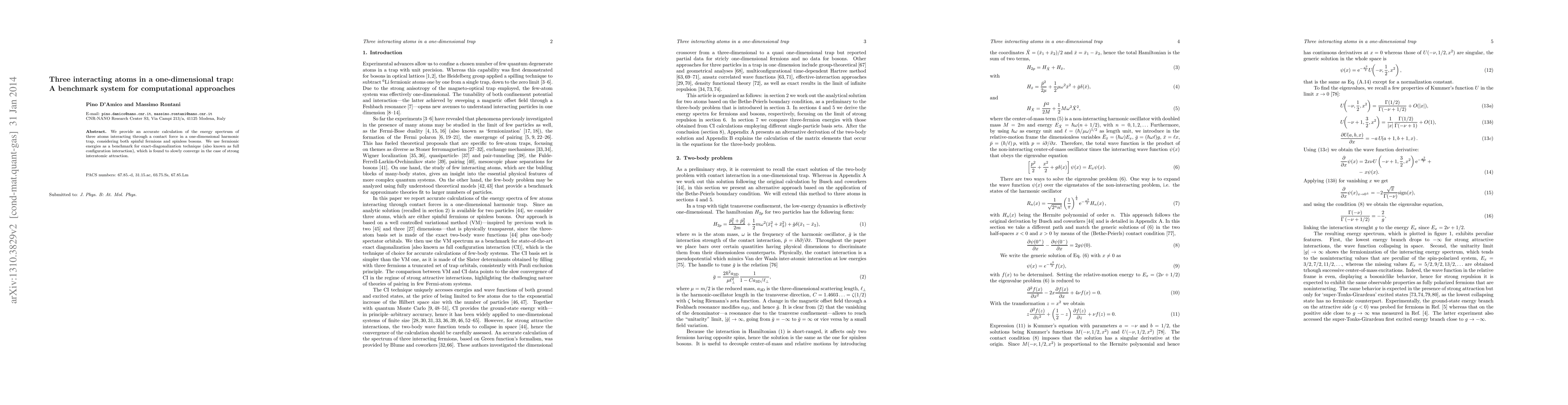 This paper calculates the energy spectrum of three interacting atoms in a one-dimensional trap, focusing on both spinful fermions and spinless bosons. The study uses fermionic energies as a benchmark for the exact-diagonalization technique, revealing its slow convergence under strong interatomic attraction.