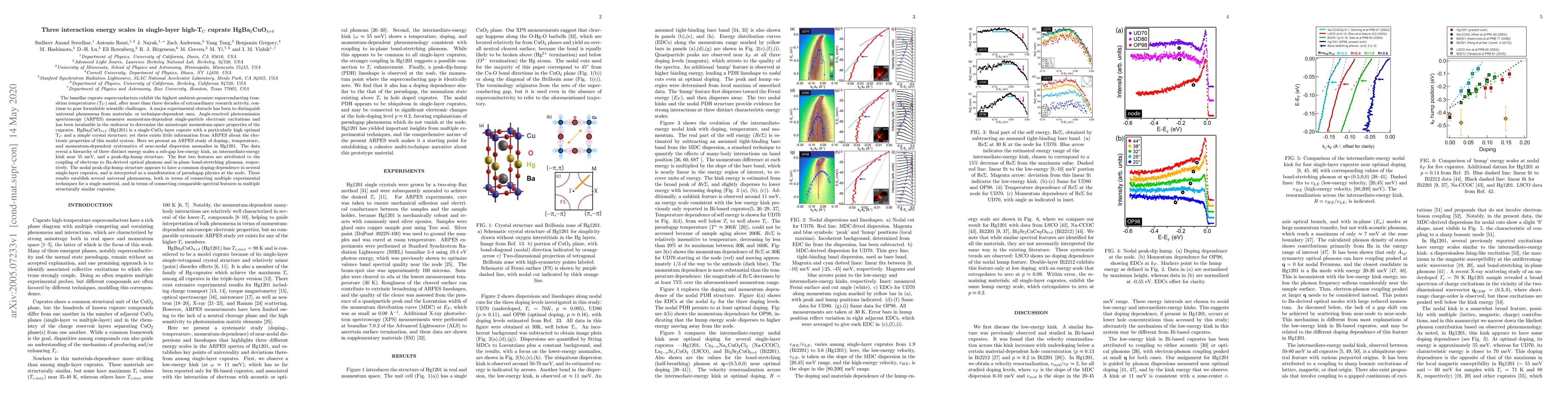 The lamellar cuprate superconductors exhibit the highest ambient-pressure superconducting transition temperatures (T$_C$) and, after more than three decades of extraordinary research activity, continue to pose formidable scientific challenges. A major experimental obstacle has been to distinguish universal phenomena from materials- or technique-dependent ones. Angle-resolved photoemission spectroscopy (ARPES) measures momentum-dependent single-particle electronic excitations and has been invaluable in the endeavor to determine the anisotropic momentum-space properties of the cuprates. HgBa$_2$CuO$_{4+\delta}$ (Hg1201) is a single-CuO$_2$-layer cuprate with a particularly high optimal T$_C$ and a simple crystal structure; yet there exists little information from ARPES about the electronic properties of this model system. Here we present an ARPES study of doping-, temperature-, and momentum-dependent systematics of near-nodal dispersion anomalies in Hg1201. The data reveal a hierarchy of three distinct energy scales -a sub-gap low-energy kink, an intermediate-energy kink near 55 meV, and a peak-dip-hump structure. The first two features are attributed to the coupling of electrons to Ba-derived optical phonons and in-plane bond-stretching phonons, respectively. The nodal peak-dip-hump structure appears to have a common doping-dependence in several single-layer cuprates, and is interpreted as a manifestation of pseudogap physics at the node. These results establish several universal phenomena, both in terms of connecting multiple experimental techniques for a single material, and in terms of connecting comparable spectral features in multiple structurally similar cuprates.