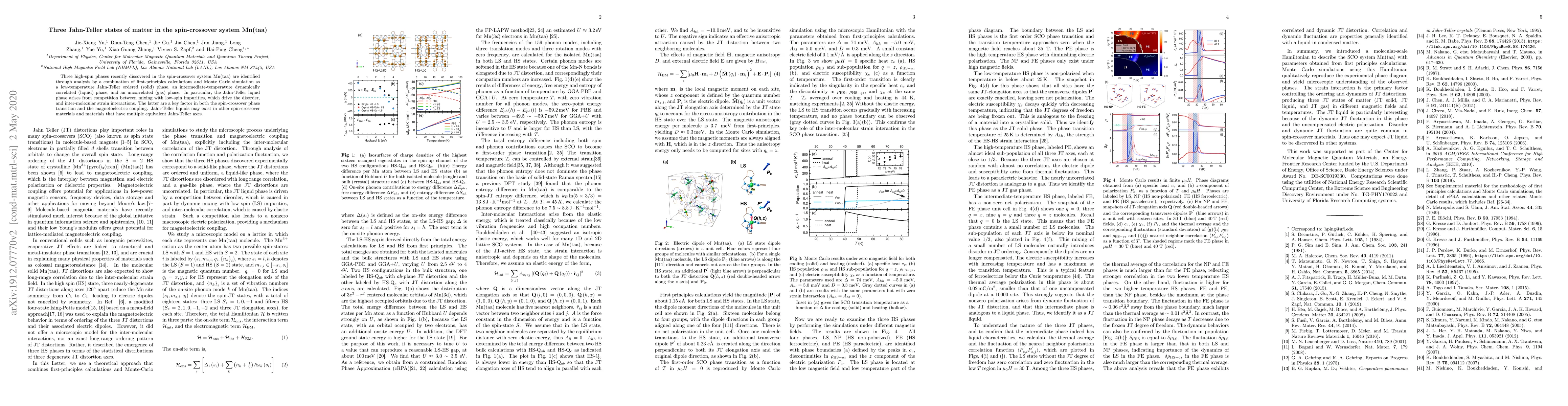 Three high-spin phases recently discovered in the spin-crossover system Mn(taa) are identified through analysis by a combination of first-principles calculations and Monte Carlo simulation as a low-temperature Jahn-Teller ordered (solid) phase, an intermediate-temperature dynamically correlated (liquid) phase, and an uncorrelated (gas) phase. In particular, the Jahn-Teller liquid phase arises from competition between mixing with low-spin impurities, which drive the disorder, and inter-molecular strain interactions. The latter are a key factor in both the spin-crossover phase transition and the magnetoelectric coupling. Jahn-Teller liquids may exist in other spin-crossover materials and materials that have multiple equivalent Jahn-Teller axes.