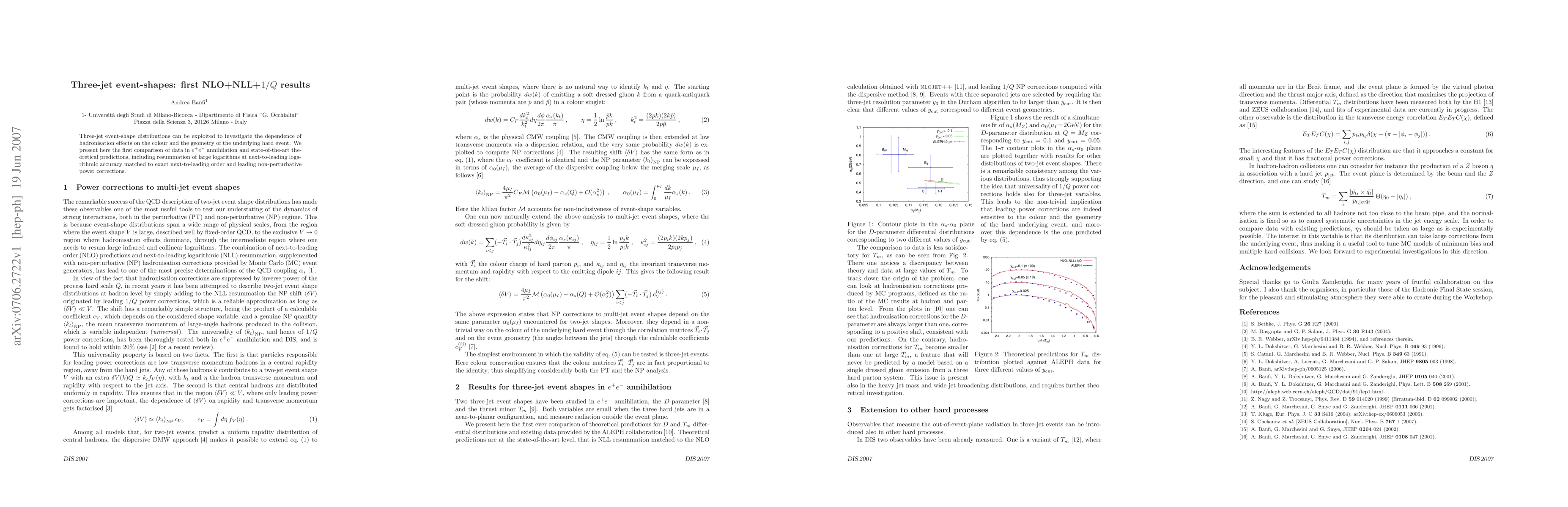 Three-jet event-shape distributions can be exploited to investigate the dependence of hadronisation effects on the colour and the geometry of the underlying hard event. We present here the first comparison of data in e+e- annihilation and state-of-the-art theoretical predictions, including resummation of large logarithms at next-to-leading logarithmic accuracy matched to exact next-to-leading order and leading non-perturbative power corrections.