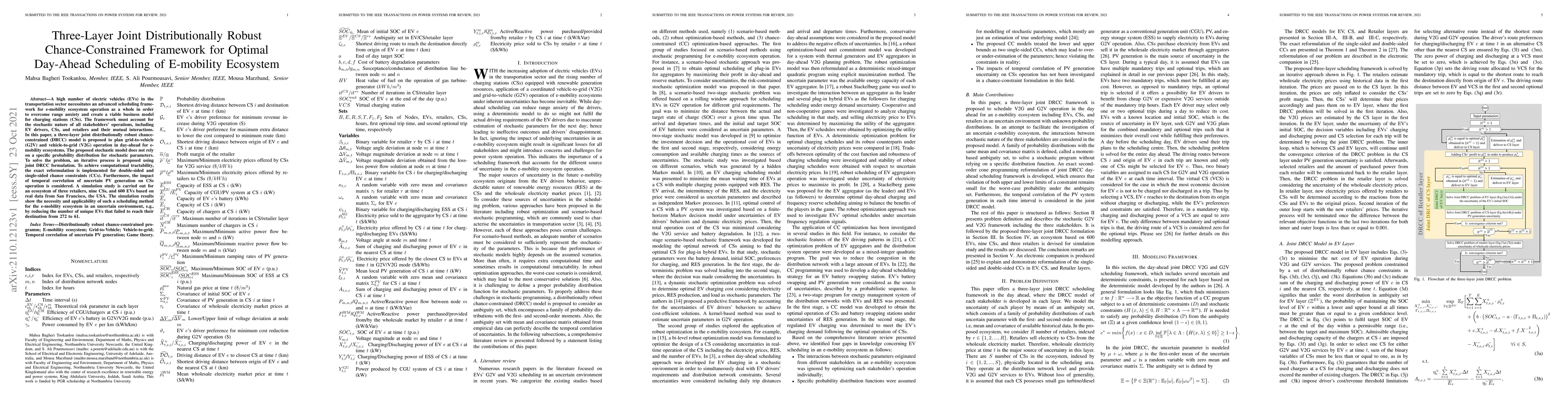 This paper proposes a three-layer joint distributionally robust chance-constrained framework for optimal day-ahead scheduling of e-mobility ecosystems, addressing the stochastic nature of EV operations, charging stations, and retailers. The model reduces the number of EVs failing to reach their destination, demonstrating its effectiveness in an uncertain environment.