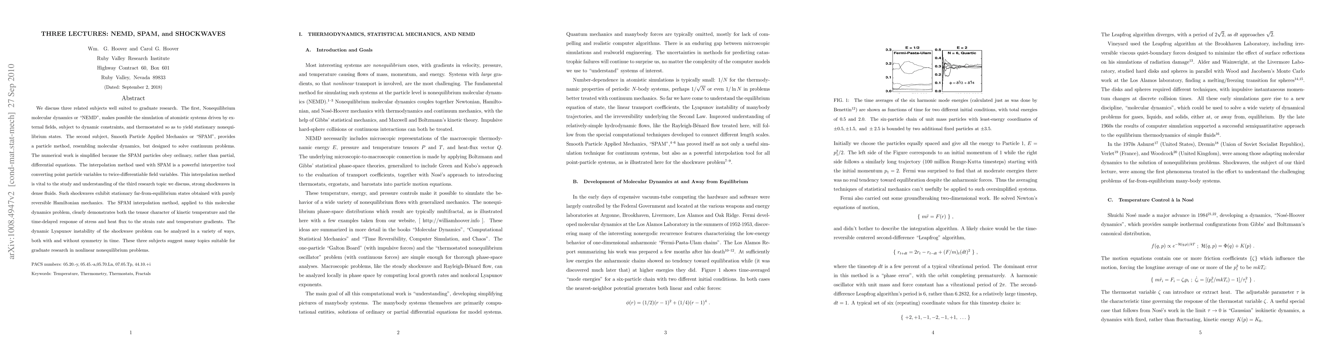 We discuss three related subjects well suited to graduate research. The first, Nonequilibrium molecular dynamics or "NEMD", makes possible the simulation of atomistic systems driven by external fields, subject to dynamic constraints, and thermostated so as to yield stationary nonequilibrium states. The second subject, Smooth Particle Applied Mechanics or "SPAM", provides a particle method, resembling molecular dynamics, but designed to solve continuum problems. The numerical work is simplified because the SPAM particles obey ordinary, rather than partial, differential equations. The interpolation method used with SPAM is a powerful interpretive tool converting point particle variables to twice-differentiable field variables. This interpolation method is vital to the study and understanding of the third research topic we discuss, strong shockwaves in dense fluids. Such shockwaves exhibit stationary far-from-equilibrium states obtained with purely reversible Hamiltonian mechanics. The SPAM interpolation method, applied to this molecular dynamics problem, clearly demonstrates both the tensor character of kinetic temperature and the time-delayed response of stress and heat flux to the strain rate and temperature gradients. The dynamic Lyapunov instability of the shockwave problem can be analyzed in a variety of ways, both with and without symmetry in time. These three subjects suggest many topics suitable for graduate research in nonlinear nonequilibrium problems.