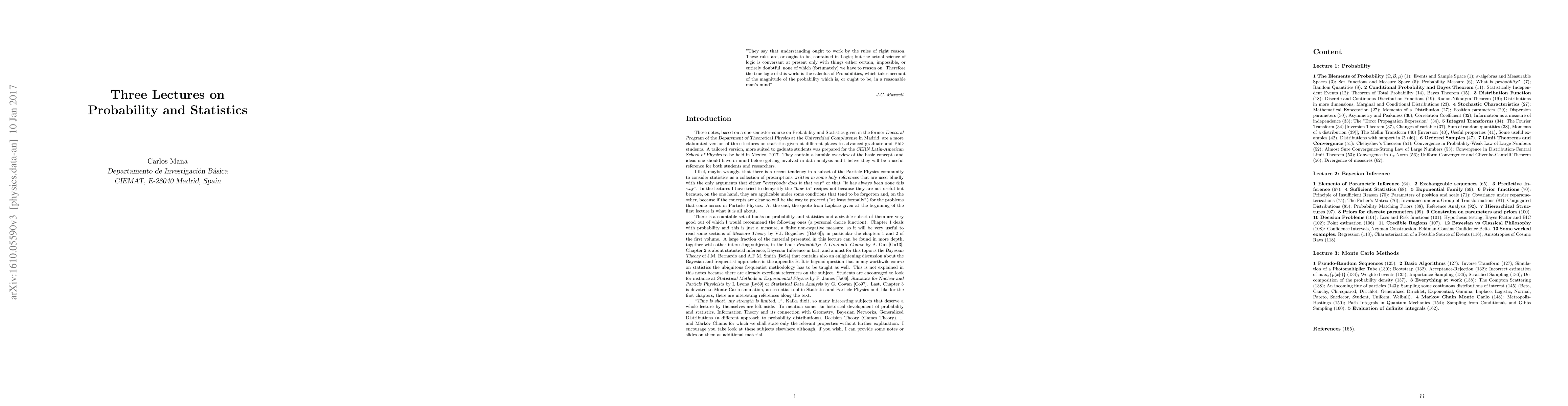 Summary: This paper provides lecture notes covering fundamental probability concepts, Bayesian inference techniques, and Monte Carlo simulation methods in three distinct lectures. It aims to introduce foundational statistical principles and advanced probabilistic modeling approaches.