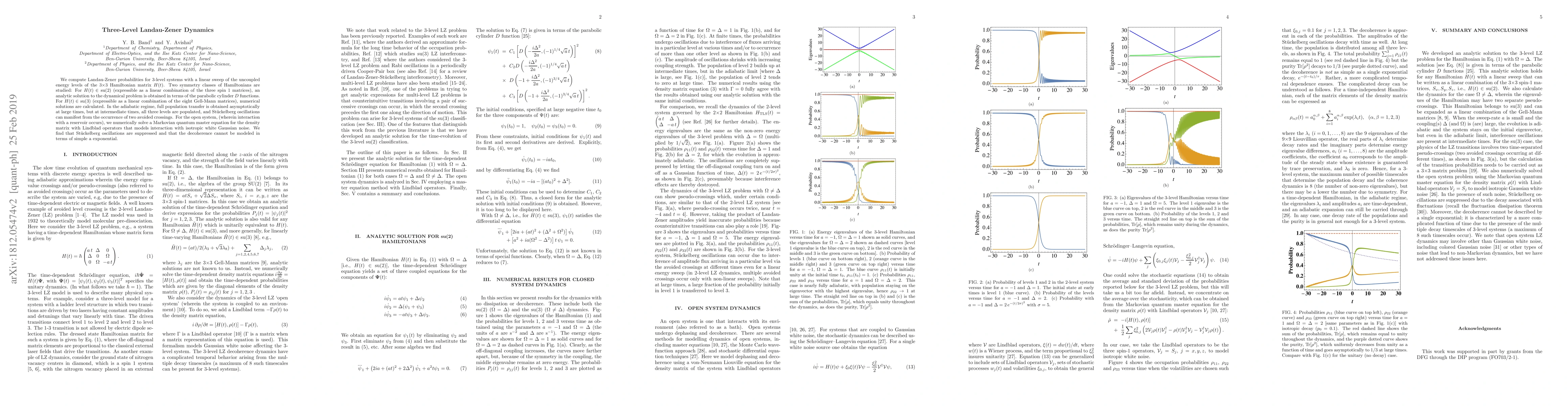 We compute Landau-Zener probabilities for 3-level systems with a linear sweep of the uncoupled energy levels of the 3$\times$3 Hamiltonian $H(t)$. Two symmetry classes of Hamiltonians are studied: For $H(t) \in$ su(2) (expressible as a linear combination of the three spin 1 matrices), an analytic solution to the problem is obtained in terms of the parabolic cylinder $D$ functions. For $H(t) \in$ su(3) (expressible as a linear combination of the eight Gell-Mann matrices), numerical solutions are obtained. In the adiabatic regime, full population transfer is obtained asymptotically at large time, but at intermediate times, all three levels are populated and St\"uckelberg oscillations are typically manifest. For the open system, (wherein interaction with a reservoir occurs), we numerically solve a Markovian quantum master equation for the density matrix with Lindblad operators that models interaction with isotropic white Gaussian noise. We find that St\"uckelberg oscillations are suppressed and that the temporal decay law of the population probabilities is not a simple exponential.