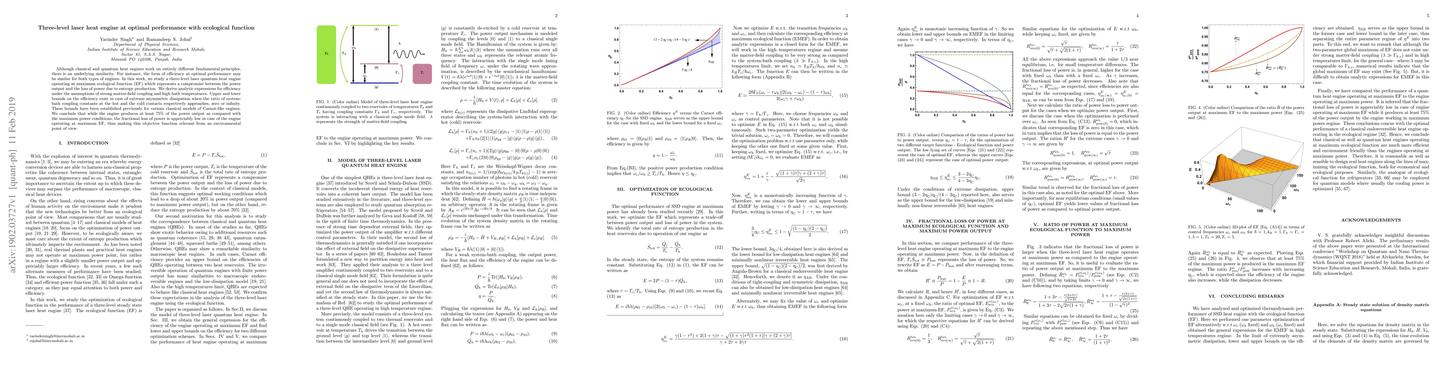 This paper investigates a three-level laser quantum heat engine operating at maximum ecological function, achieving high efficiency with minimal power loss due to entropy production. The study derives analytic expressions for efficiency under strong coupling and high bath temperatures, showing that the engine operates at least 75% of maximum power with a low fractional loss, making it environmentally favorable.