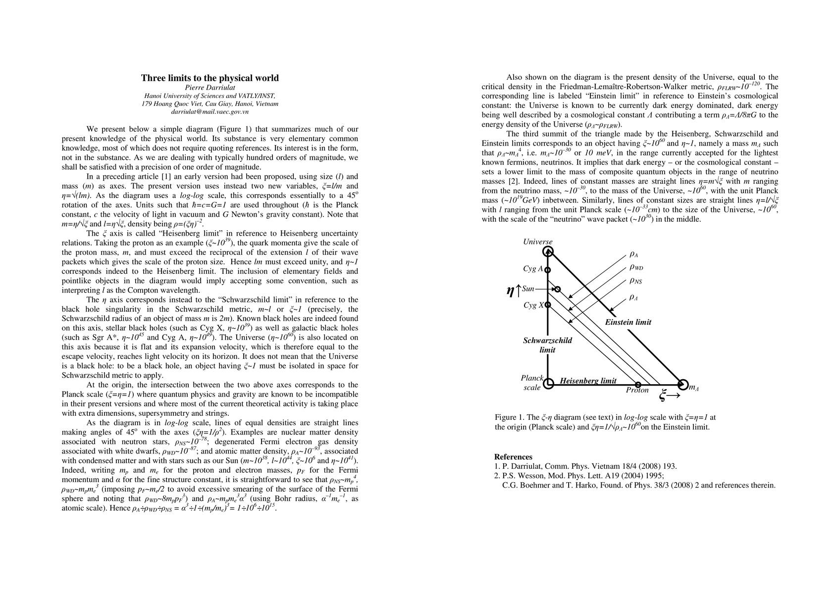 Three limits to the physical world (quantum physics, gravity and dark energy) are presented on a triangular diagram having as summits the Planck scale, the Universe and a neutrino-like object.