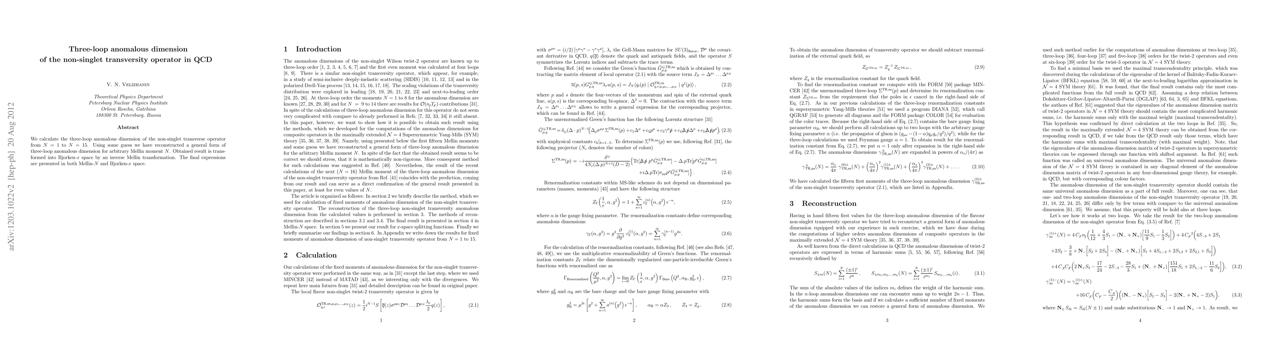 We calculate the three-loop anomalous dimension of the non-singlet transverse operator from N=1 to N=15. Using some guess we have reconstructed a general form of three-loop anomalous dimension for arbitrary Mellin moment N. Obtained result is transformed into Bjorken-x space by an inverse Mellin transformation. The final expressions are presented in both Mellin-N and Bjorken-x space.