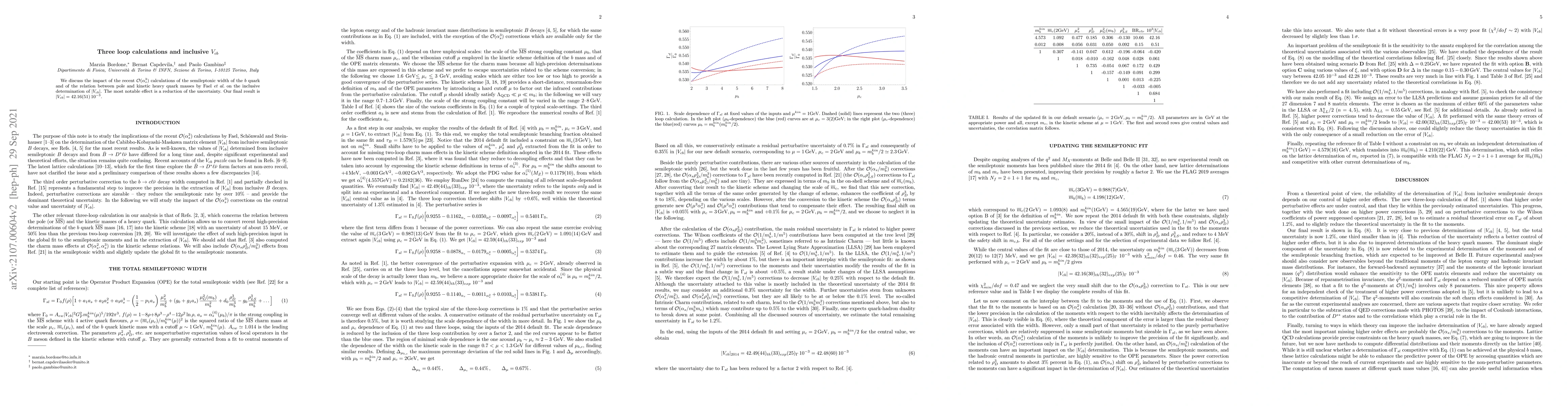 We discuss the impact of the recent $\mathcal{O}(\alpha_s^3)$ calculations of the semileptonic width of the $b$ quark and of the relation between pole and kinetic heavy quark masses by Fael et al. on the inclusive determination of $|V_{cb}|$. The most notable effect is a reduction of the uncertainty. Our final result is $|V_{cb}|=42.16(51)\, 10^{-3}$.