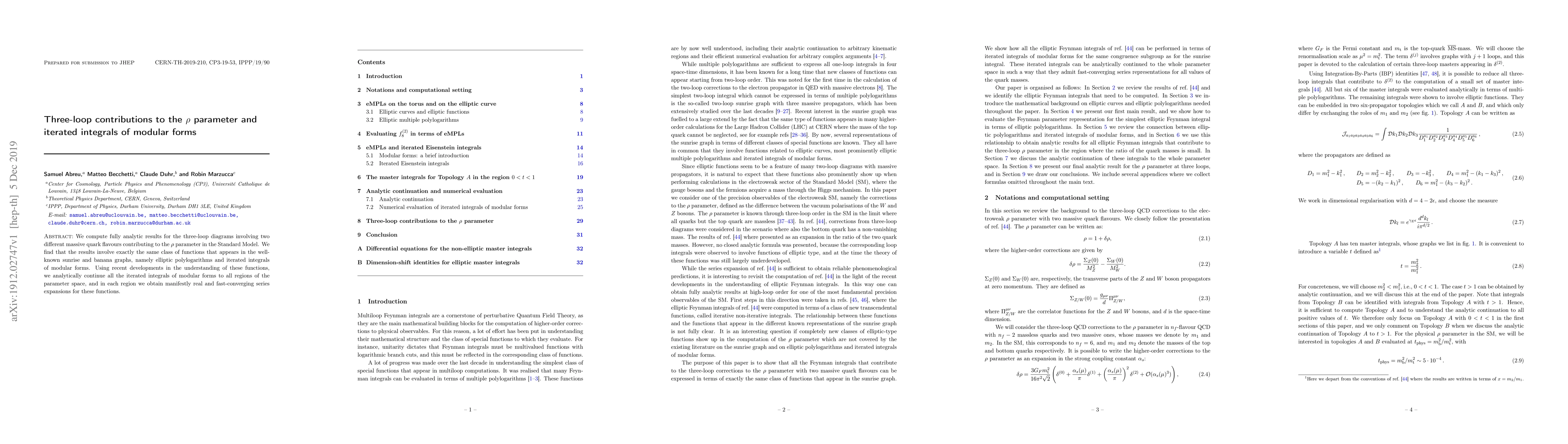 This paper computes three-loop contributions to the $\rho$ parameter in the Standard Model, revealing that they involve elliptic polylogarithms and iterated integrals of modular forms. The authors analytically continue these functions to all regions, providing real and fast-converging series expansions.