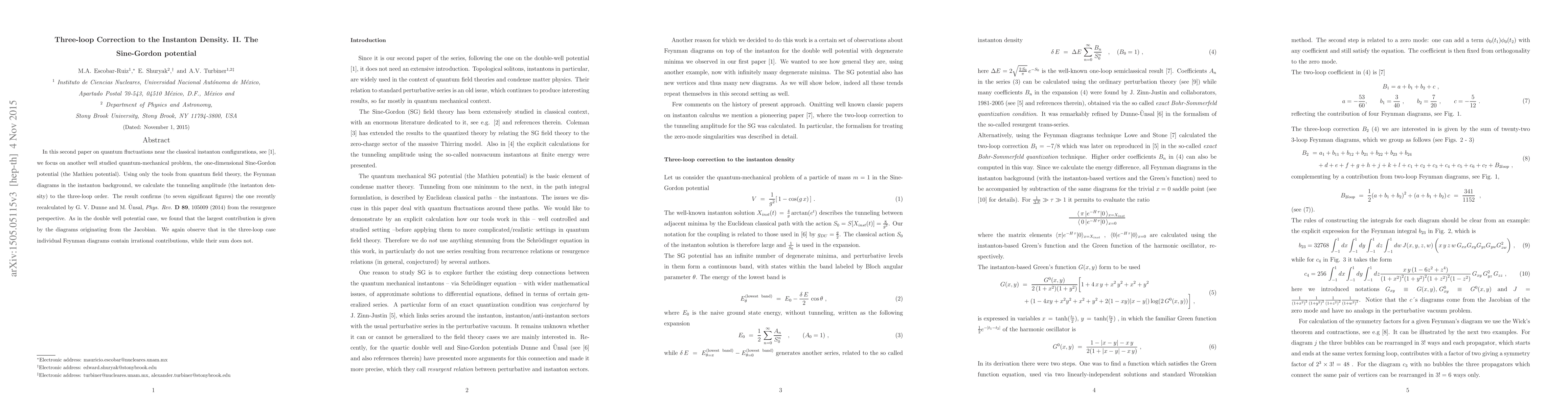 In this second paper on quantum fluctuations near the classical instanton configurations, see {\em Phys. Rev. D \bf 92}, 025046 (2015) and arXiv:1501.03993, we focus on another well studied quantum-mechanical problem, the one-dimensional Sine-Gordon potential (the Mathieu potential). Using only the tools from quantum field theory, the Feynman diagrams in the instanton background, we calculate the tunneling amplitude (the instanton density) to the three-loop order. The result confirms (to seven significant figures) the one recently recalculated by G. V. Dunne and M. \"{U}nsal, {\it Phys. Rev. \bf D 89}, 105009 (2014) from the resurgence perspective. As in the double well potential case, we found that the largest contribution is given by the diagrams originating from the Jacobian. We again observe that in the three-loop case individual Feynman diagrams contain irrational contributions, while their sum does not.