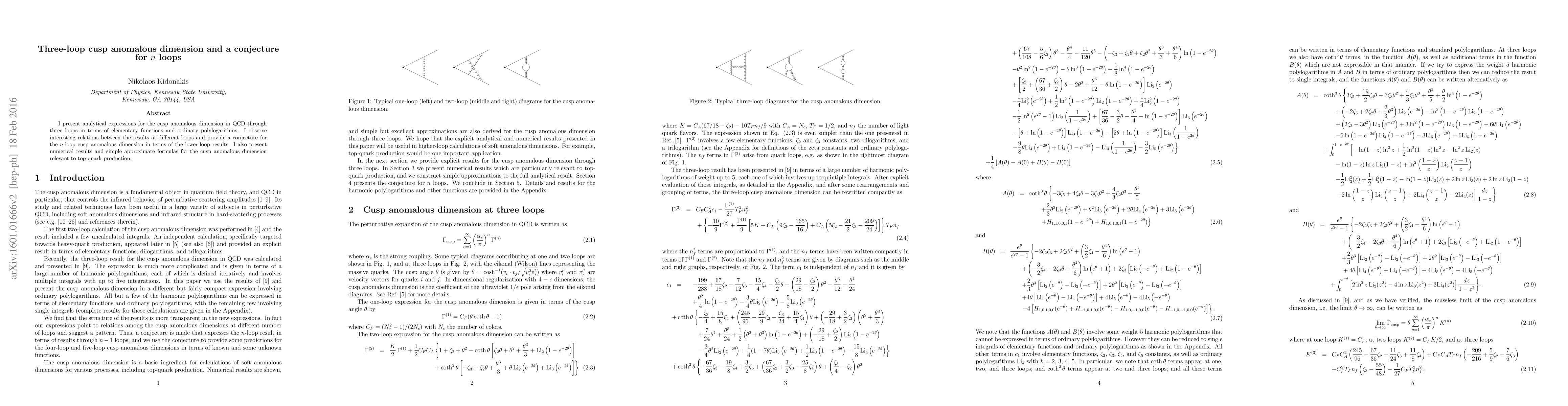 I present analytical expressions for the cusp anomalous dimension in QCD through three loops in terms of elementary functions and ordinary polylogarithms. I observe interesting relations between the results at different loops and provide a conjecture for the $n$-loop cusp anomalous dimension in terms of the lower-loop results. I also present numerical results and simple approximate formulas for the cusp anomalous dimension relevant to top-quark production.